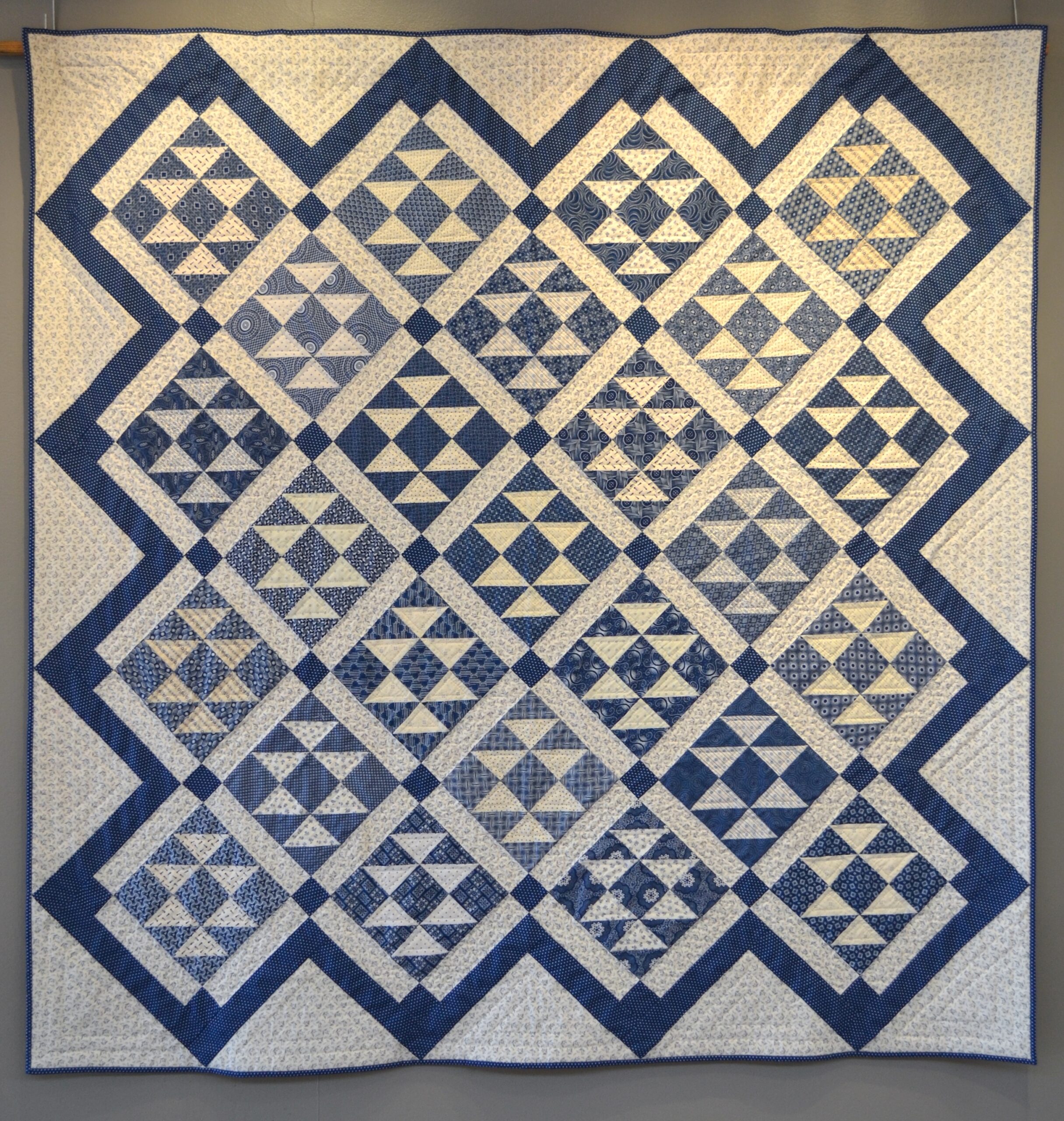 Machine pieced and hand quilted by Margaret Schatz. This is my second large hand quilting project and hopefully will not be my last. I’m fortunate to be a member of a group of other hand quilters. I learned several techniques for marking and quilting, which helped me cross the finish line.