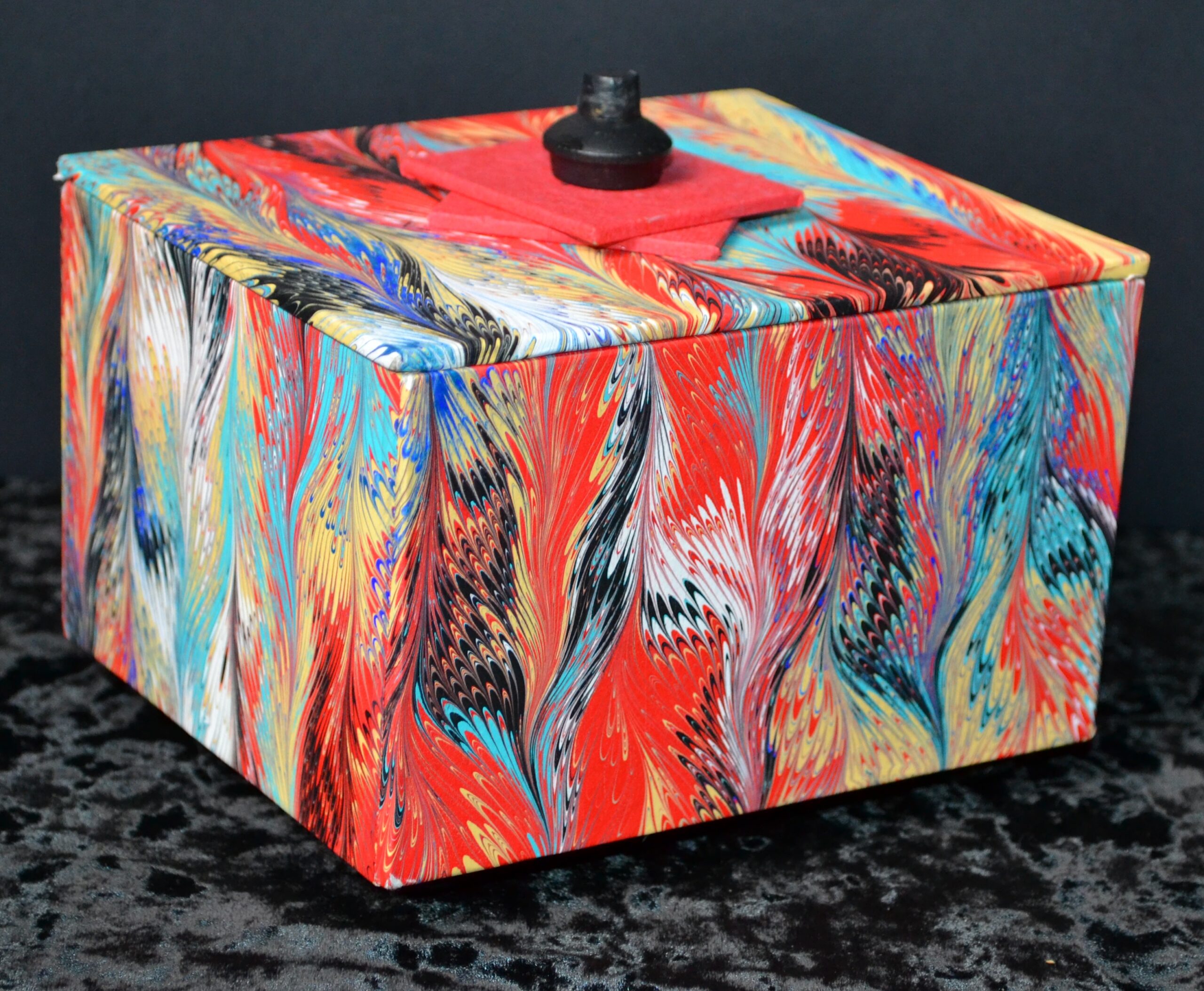 Cartonnage: hand built box covered in marbled paper.