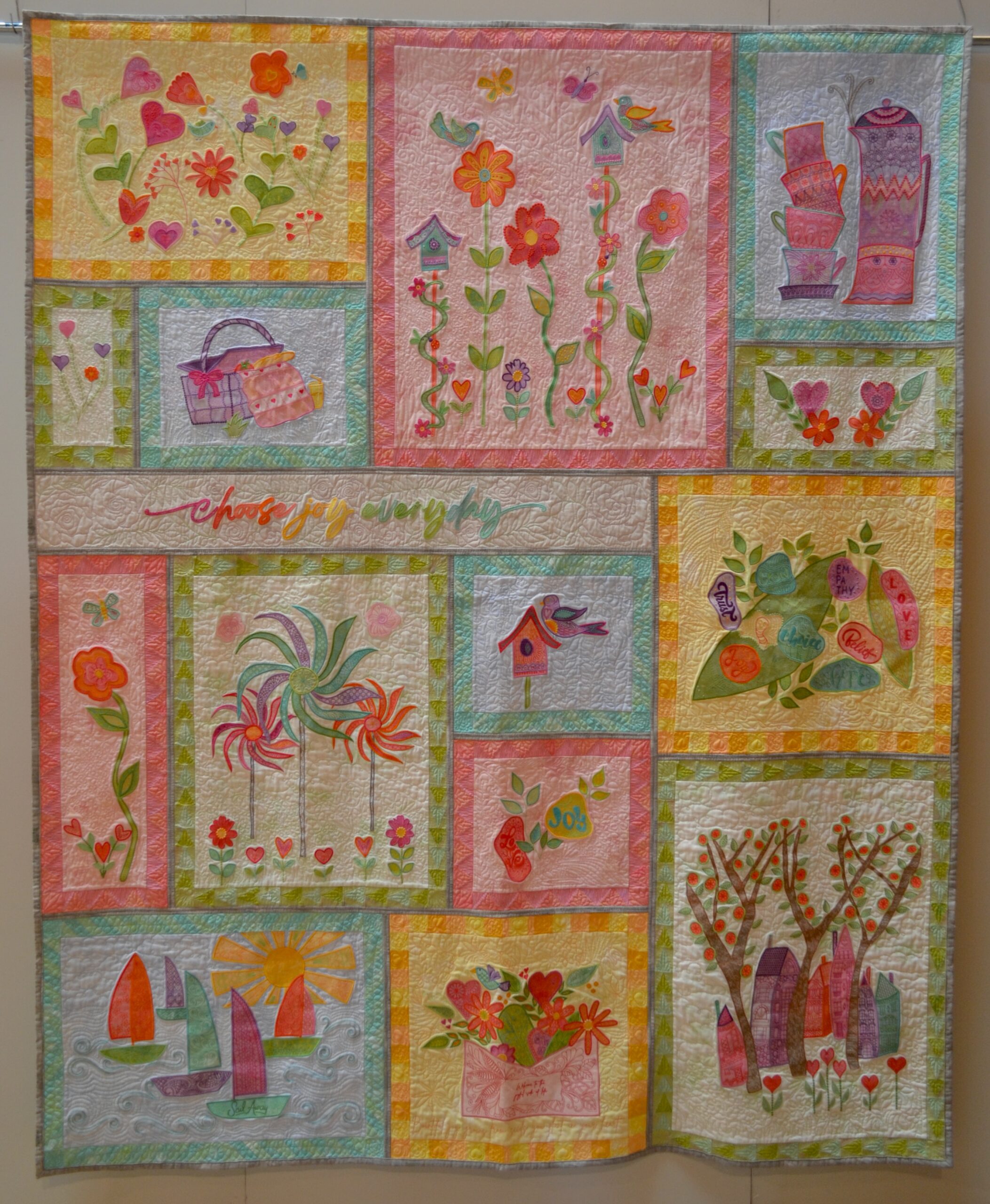 Machine-embroidered applique; embroidery machine quilting in the hoop. Applique pieces cut with digital cutting machine (Brother ScanNCut).
