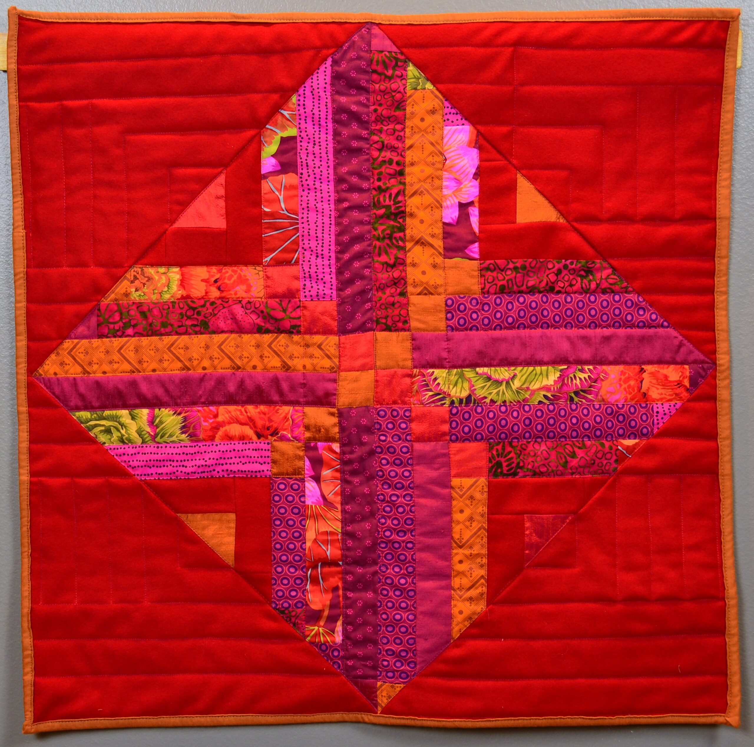Made of cotton commercial fabrics and some hand dyed fabrics. Machine pieced, long arm machine quilted.