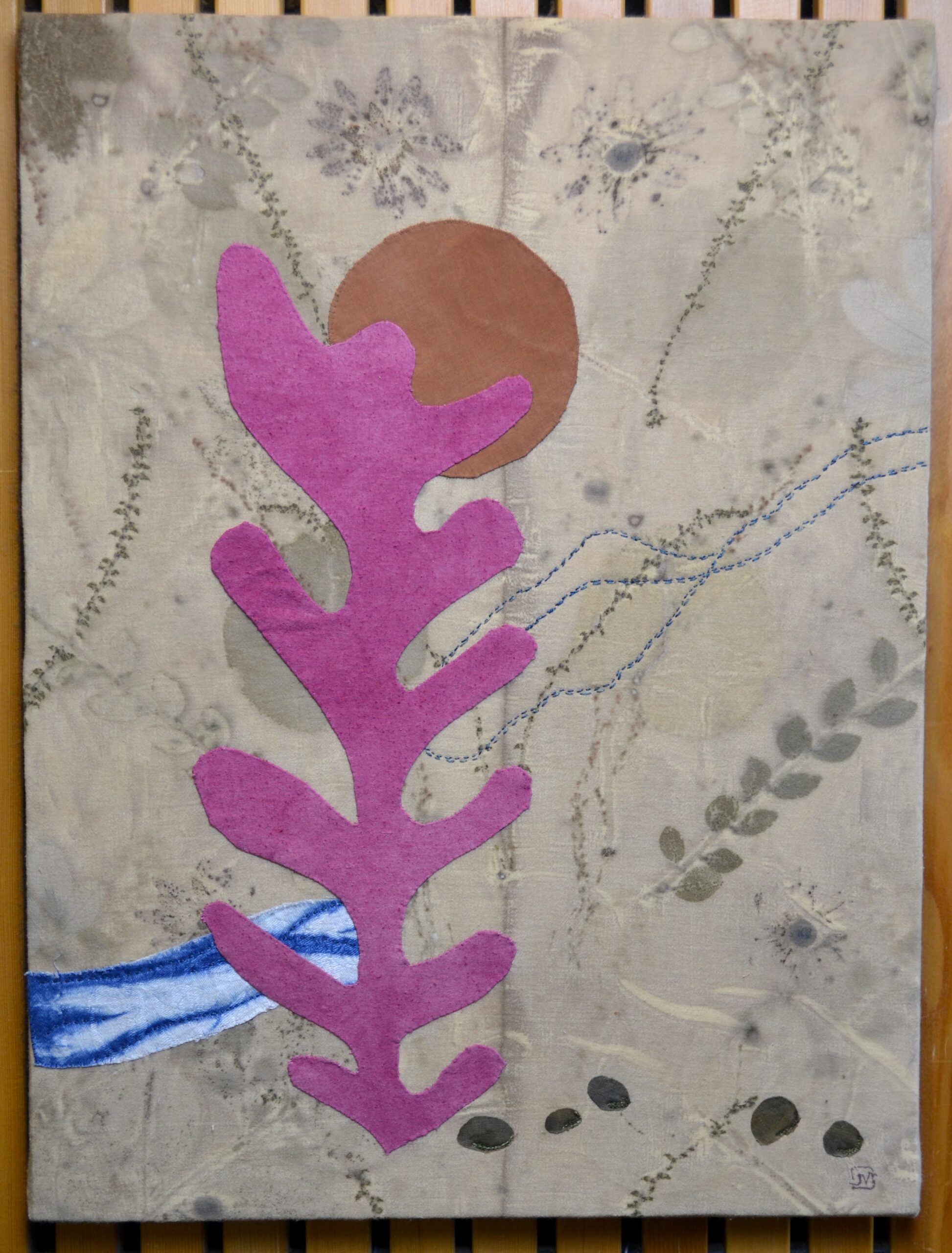 Botanically printed and hand naturally dyed cotton and silk. Indigo shibori. Hand appliqued. Hand and machine embroidery.