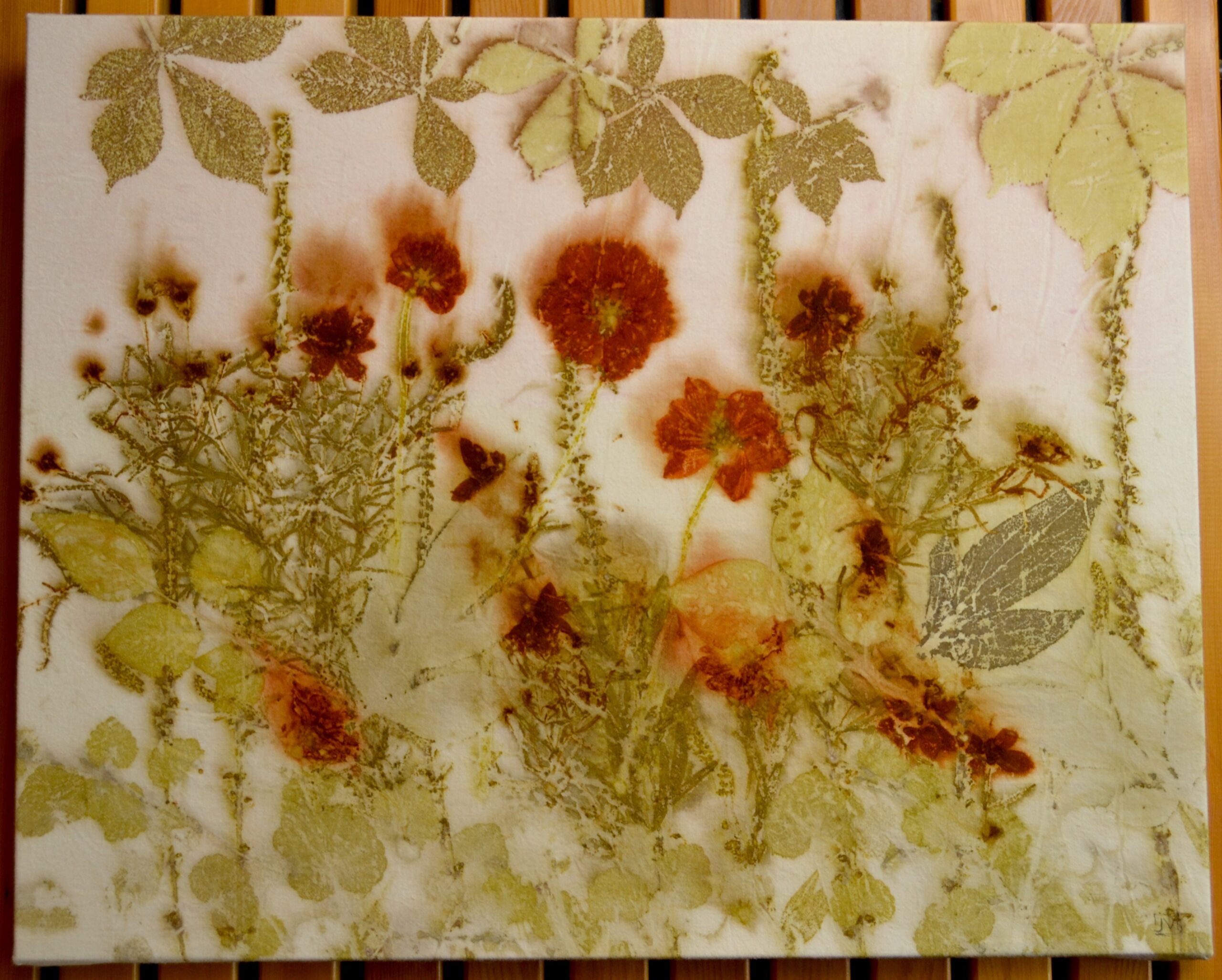 Botanically printed on cotton using flowers and plants from my garden and neighborhood.