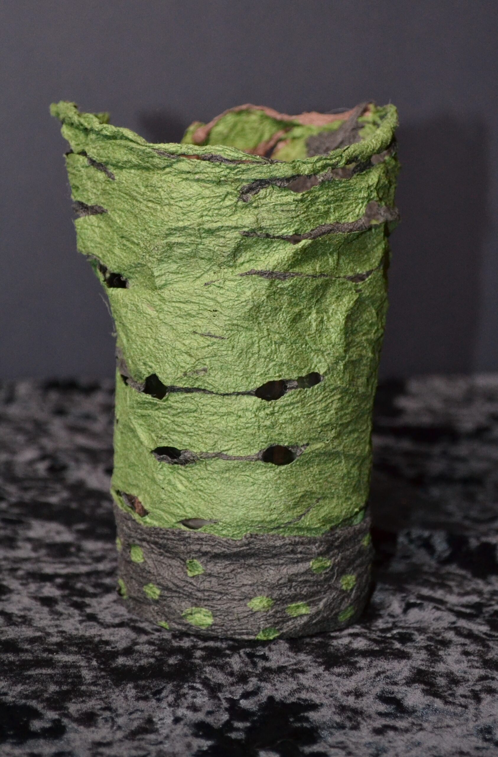 Three different colors of dyed Korean mulberry paper (Hanji) were layered, merged, texturized, and shaped by a wet agitation process called Joomchi. Once dried, the resulting sheet was turned into functional art by twisting, folding, and forming it into a cylinder and then attaching the ends.