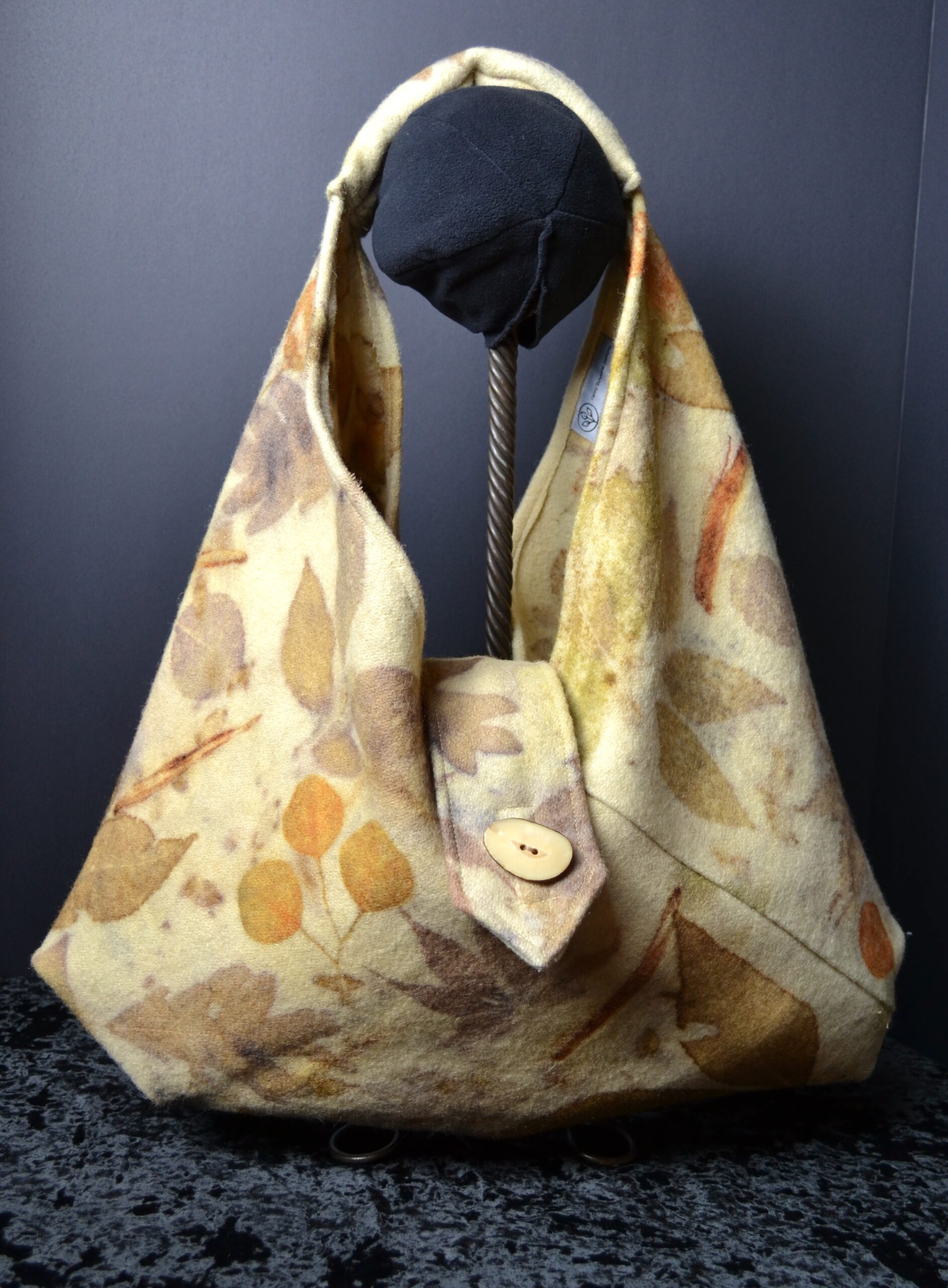 I up-cycled a yellow vintage blanket. Tannin rich Leaves are placed on the blanket piece, then rolled around a copper pipe. The bundle is steamed for 2 hours above water containing vinegar and both iron and aluminum objects. The dried fabric is then cut and sewn into this Oragami style tote.