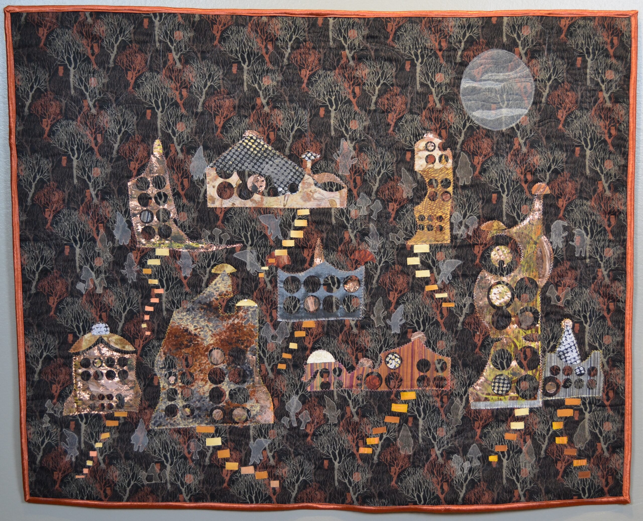 Appliqué, machine quilted, thread couching, and decorative threads.