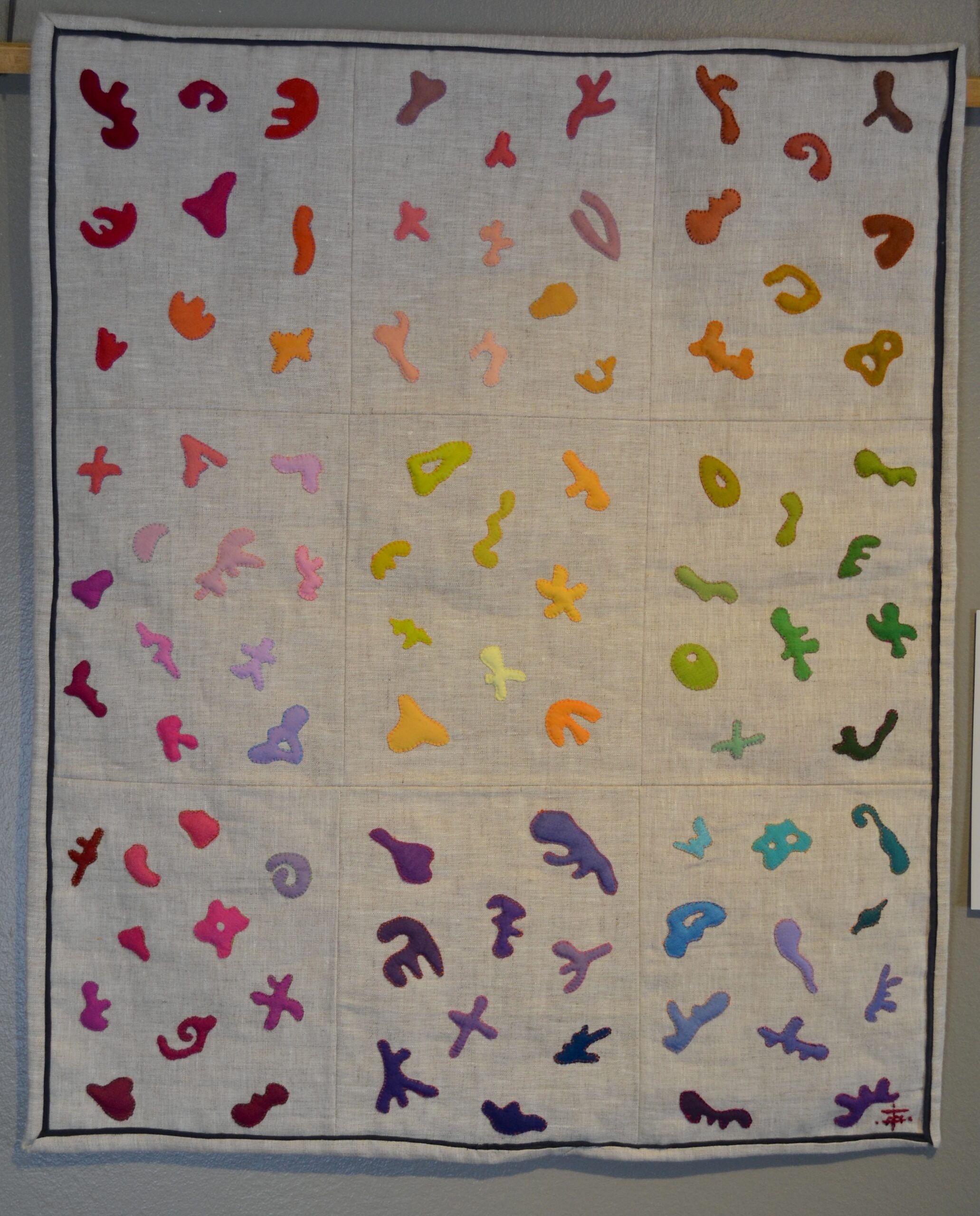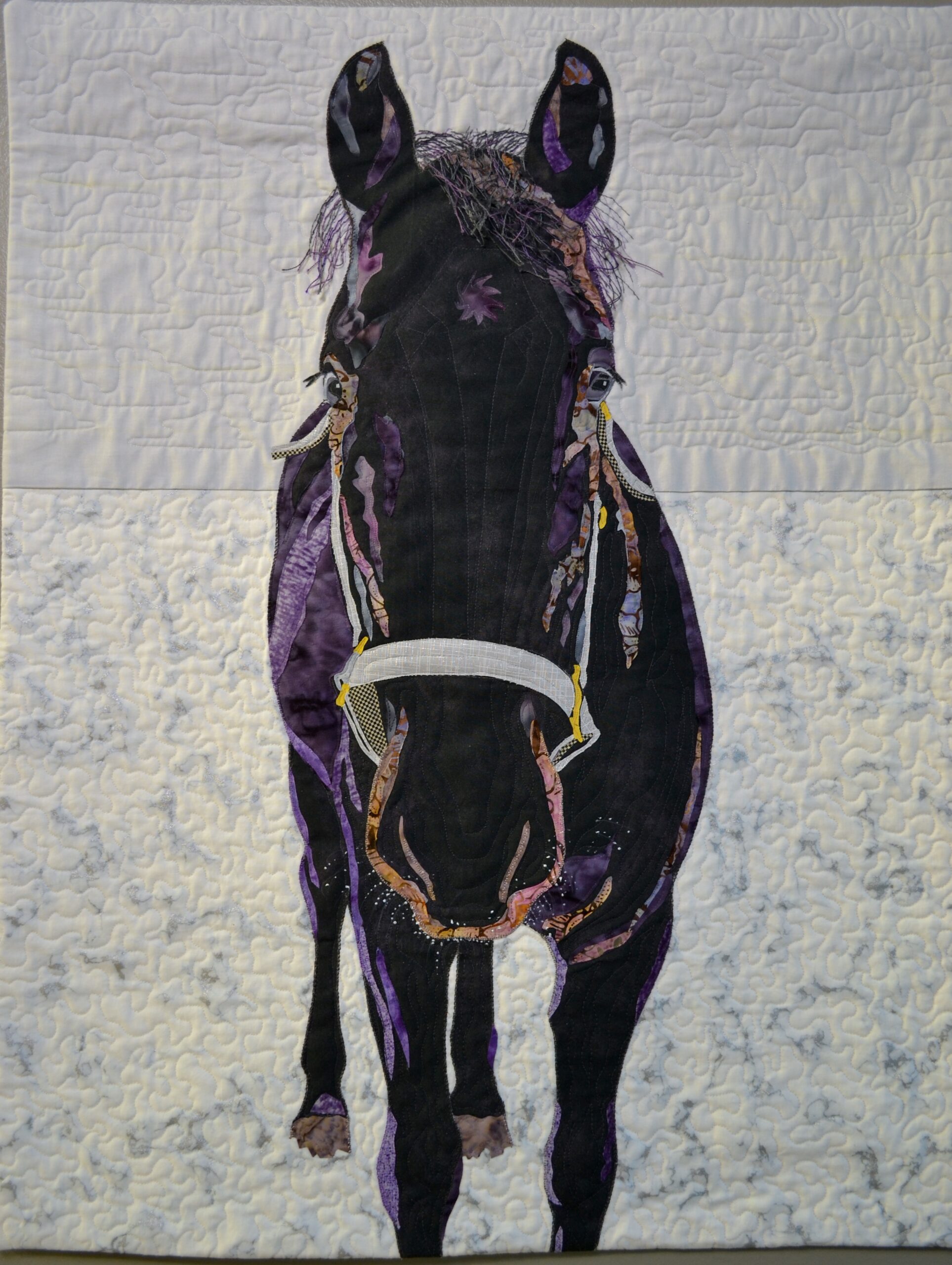 This quilted portrait of my horse, Gavi, started with a photo I traced onto freezer paper. I then fused many pieces of fabric to fill in the portrait, finishing with an embroidered mane. The ice drops on his whiskers are made of white fabric paint. Machine quilted.