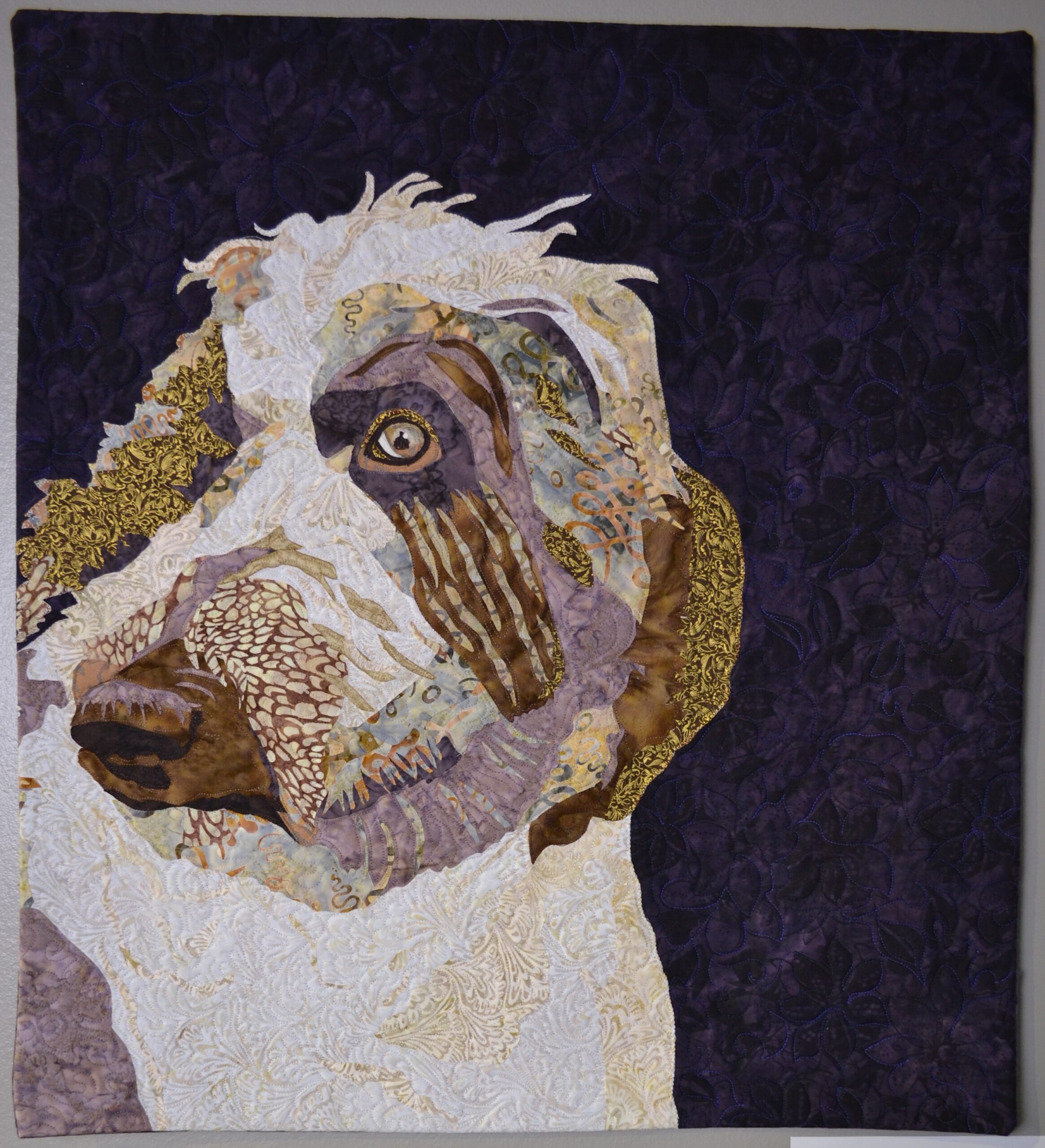 This is a quilt collage portrait of Toby, my daughter Hannah and son-in-law Tim’s Goldendoodle. It started as an enlarged photograph traced onto freezer paper. I then filled in the portrait with fused cotton fabric pieces before quilting it. Can you spot the photographer in Toby’s eye?