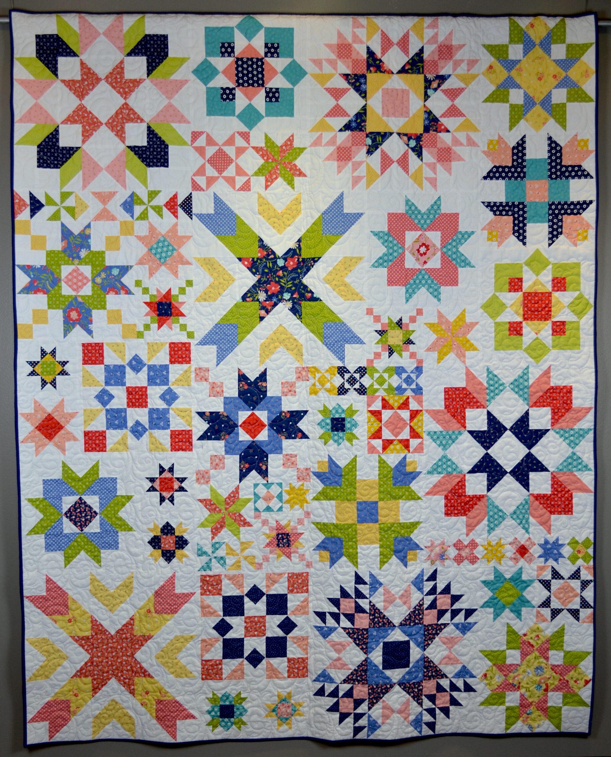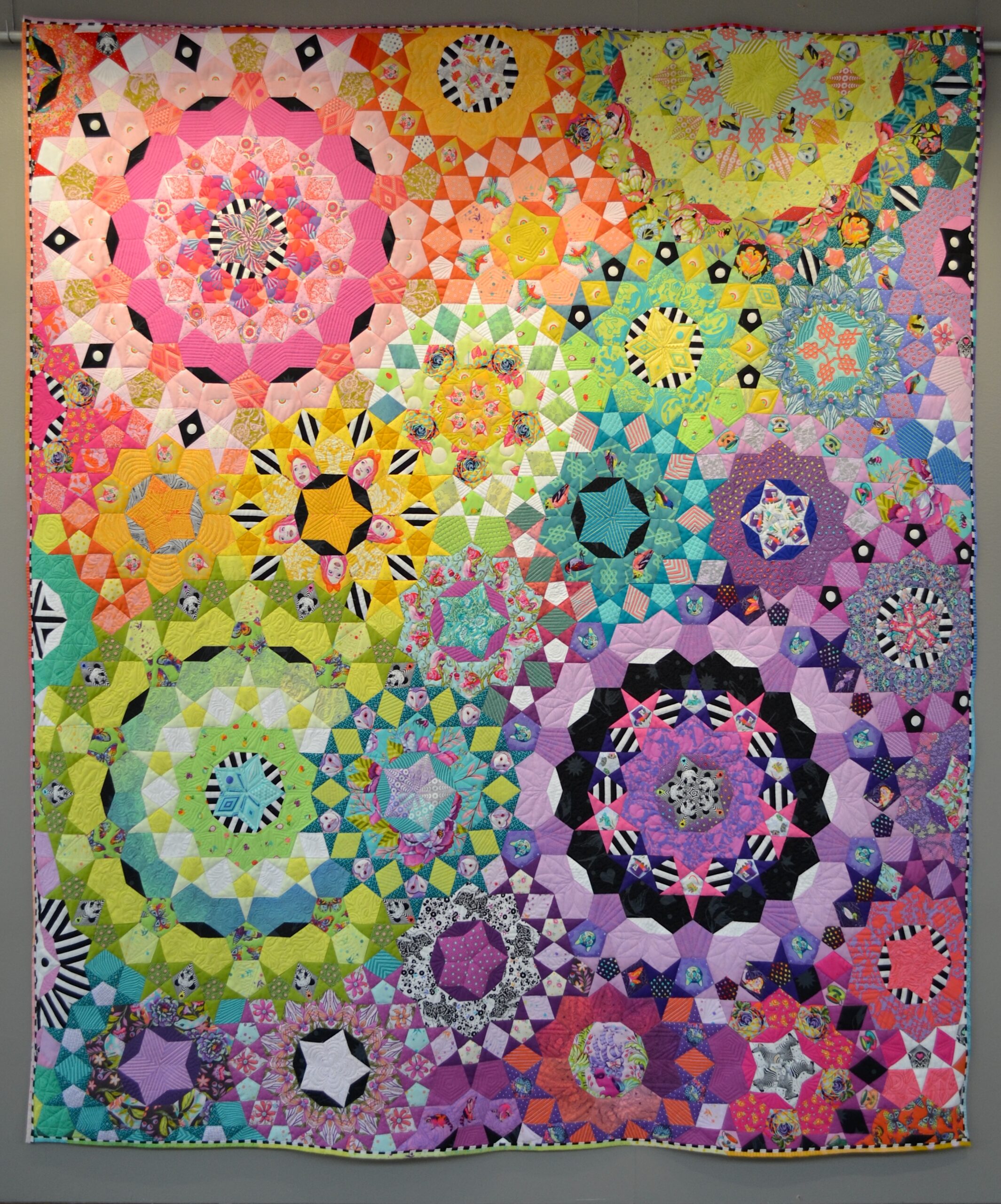18 Months 2,309 Paper Pieces Nearly 36 yards of Fabric & Countless Hours of sewing – phew! Pattern: La Passacaglia by Willyne Hammerstein, adapted by Pink Door Fabric for an 18 BOM (block of the month).