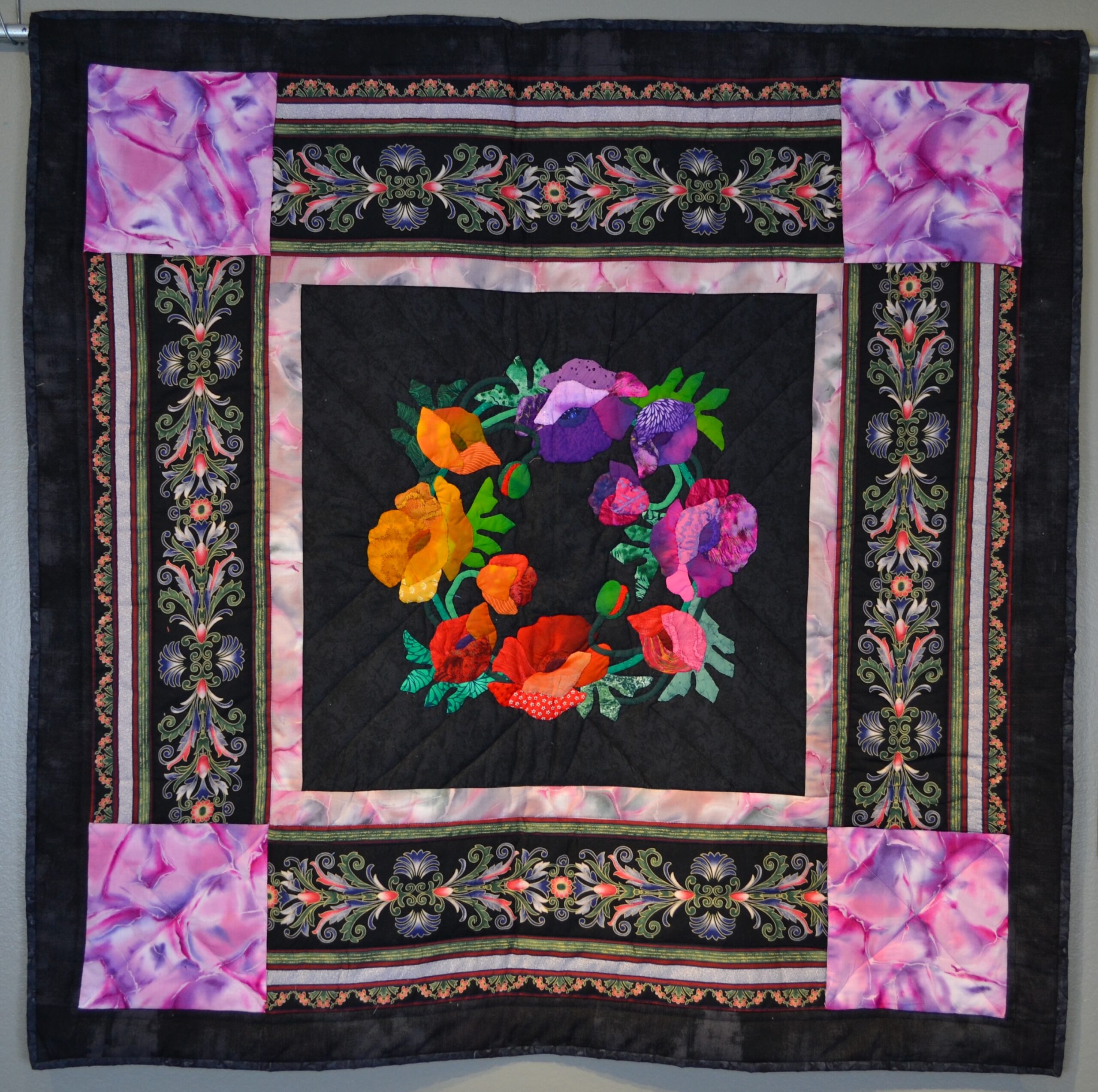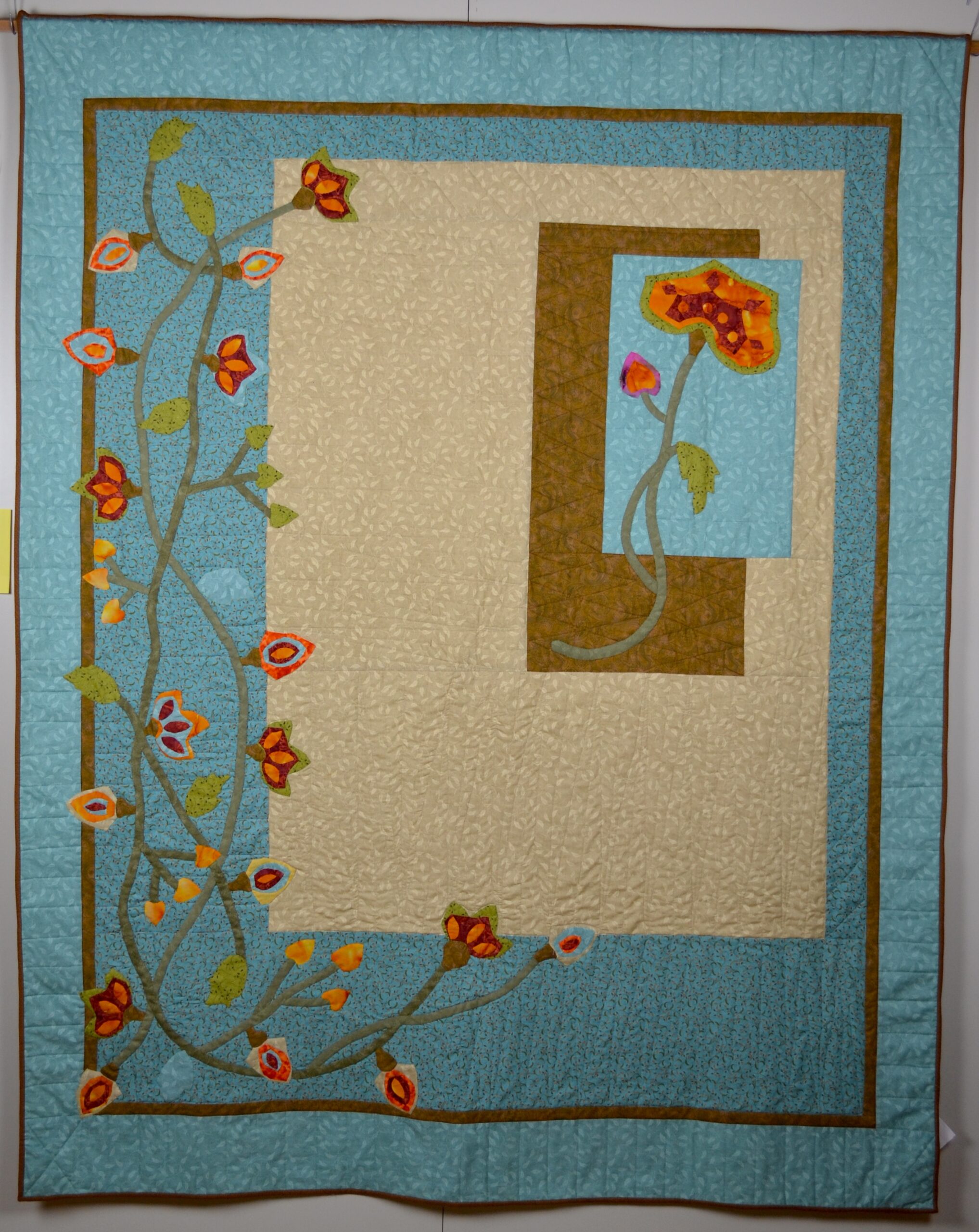 The design is hand appliqué and machine pieced, and hand and machine quilted.