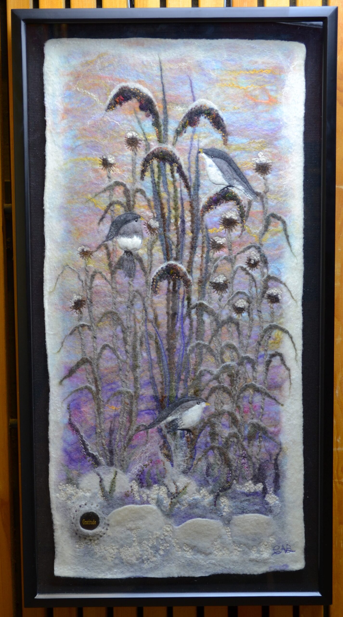 Felted with several types of wool, yarns and silk and then machine and hand stitched for detail, gratitude stone embedded.