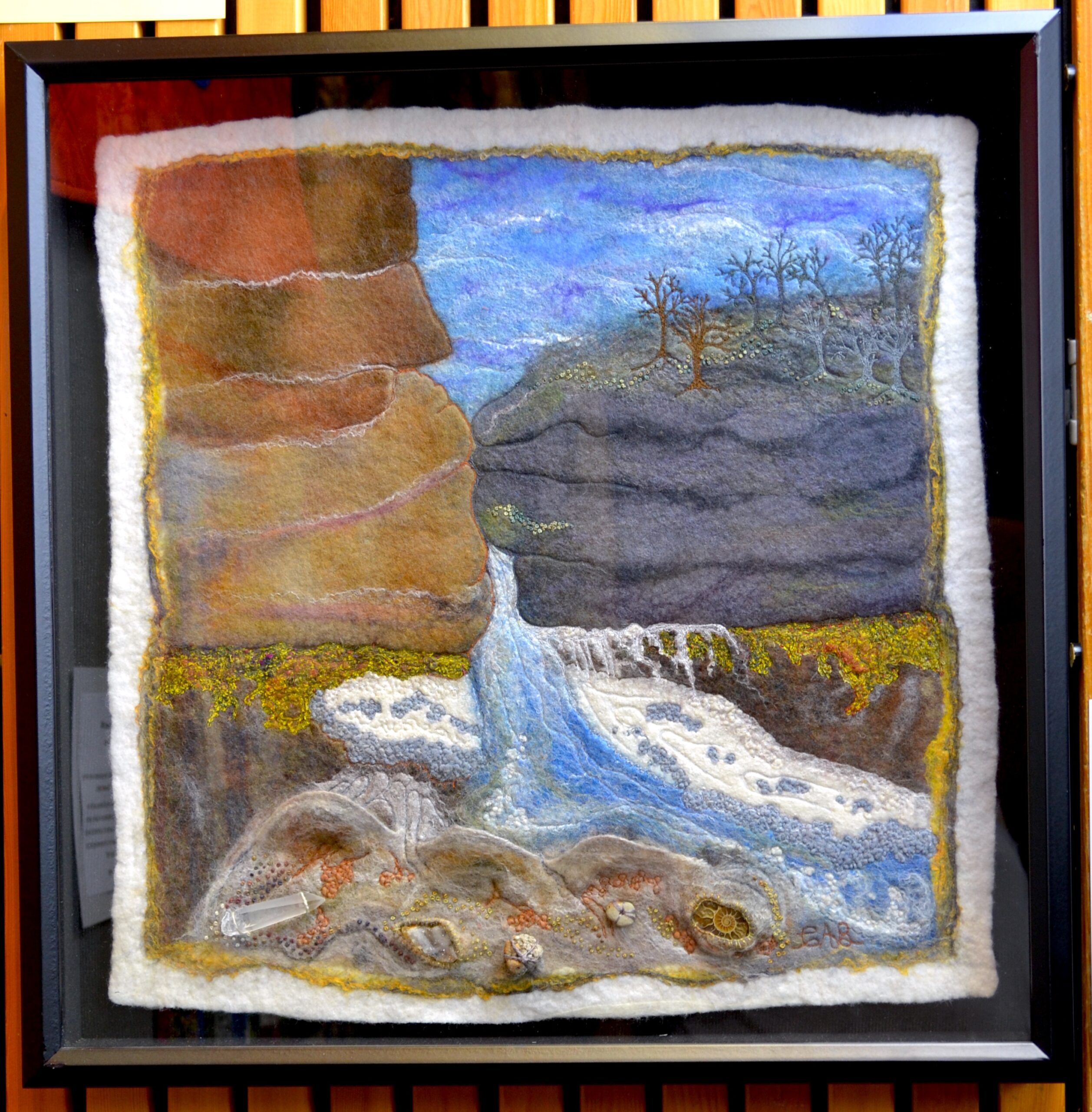 Hand wet felted with various types of wools and silk, machine and hand embroidery, embedded crystals and fossils