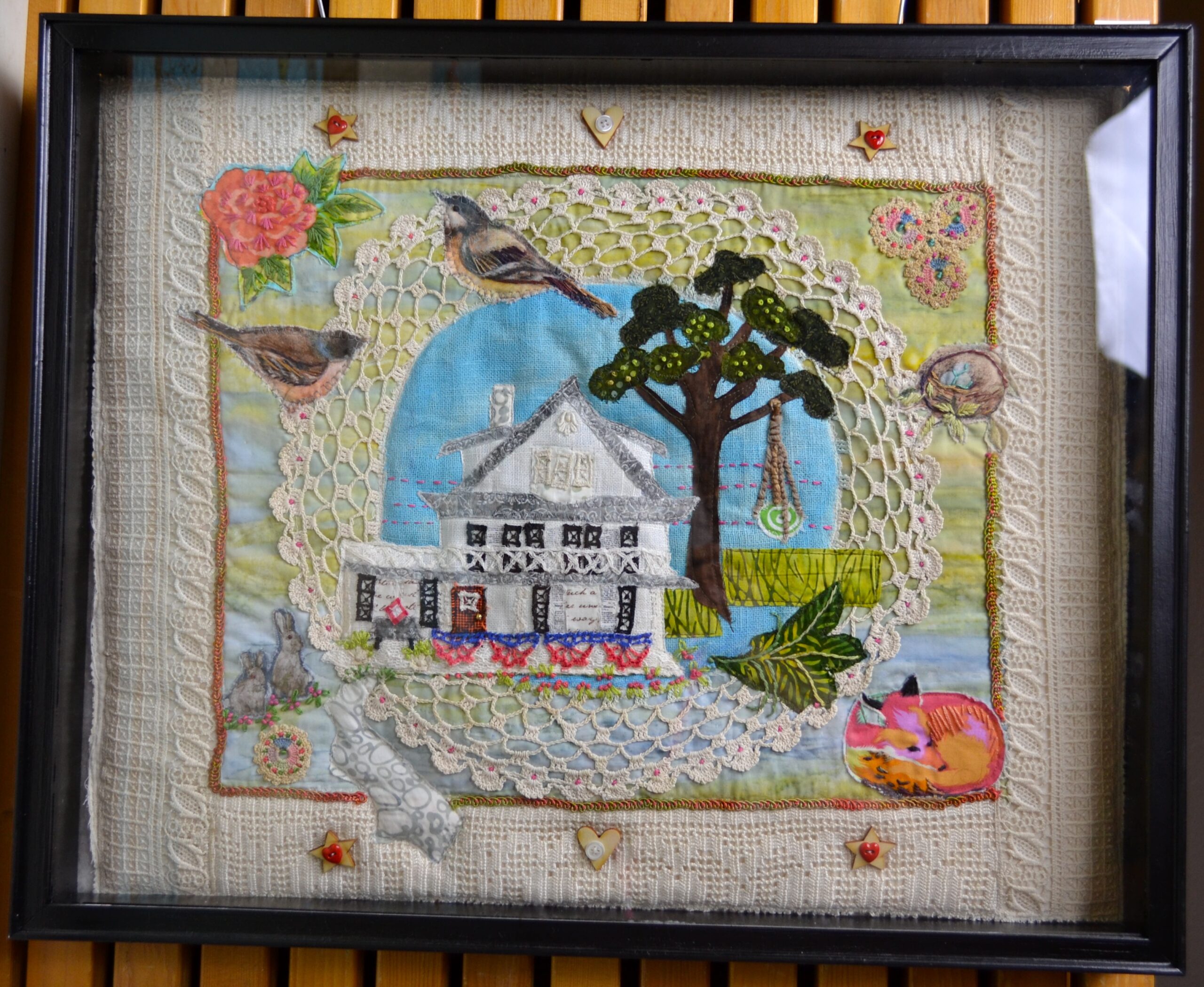 Hand embroidered with fabric collage.