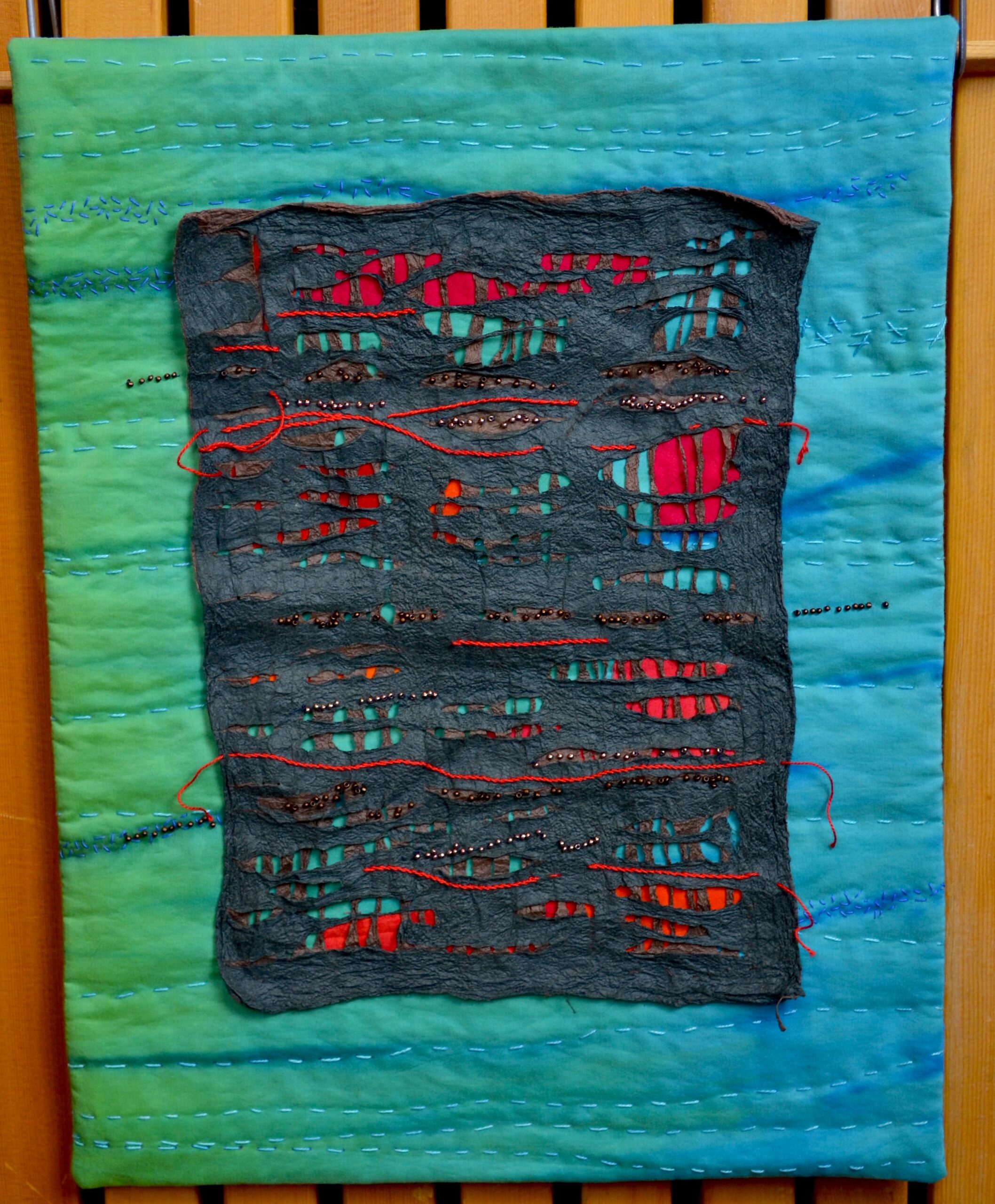 Joomchi mulberry paper, beading, hand embroidery, hand dyed silk