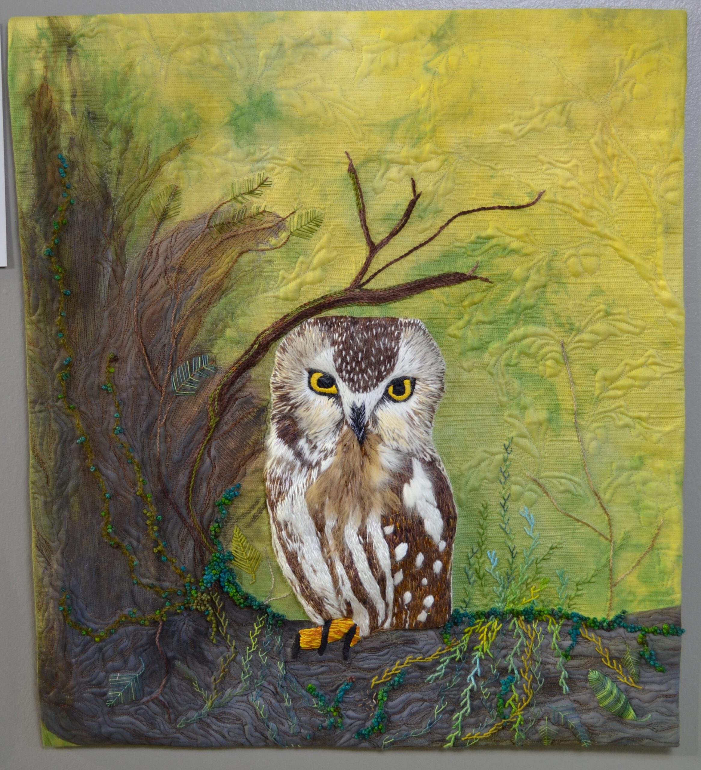I hand dyed a vintage tablecloth for the background. I painted in the dead tree using acrylic paints. The Saw-Whet Owl was hand embroidered and added into the tree followed by other organic embroidery. This piece was inspired from a photo by Leroy Buckley, used with his permission.