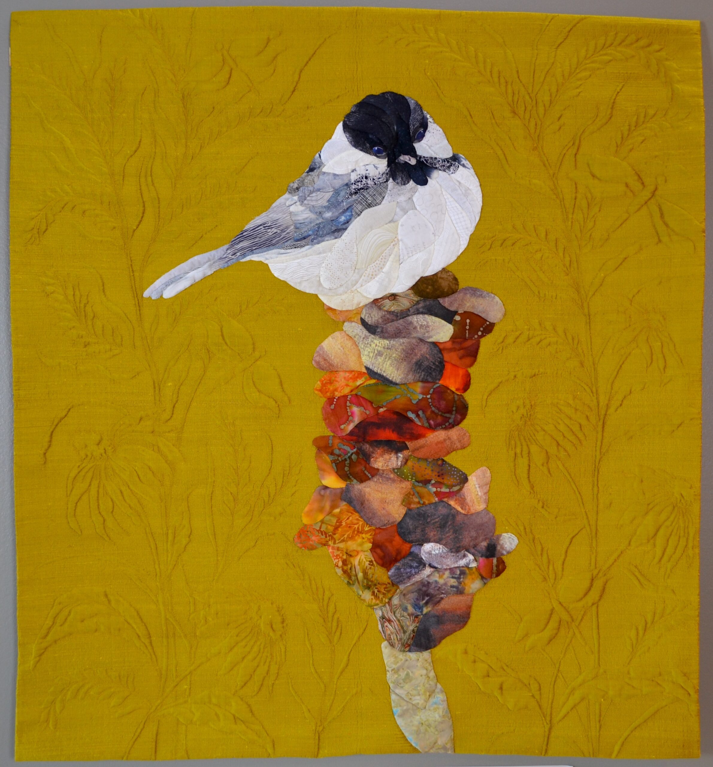 The chickadee and cattail are Hand appliquéd using cotton fabric. The background is silk.