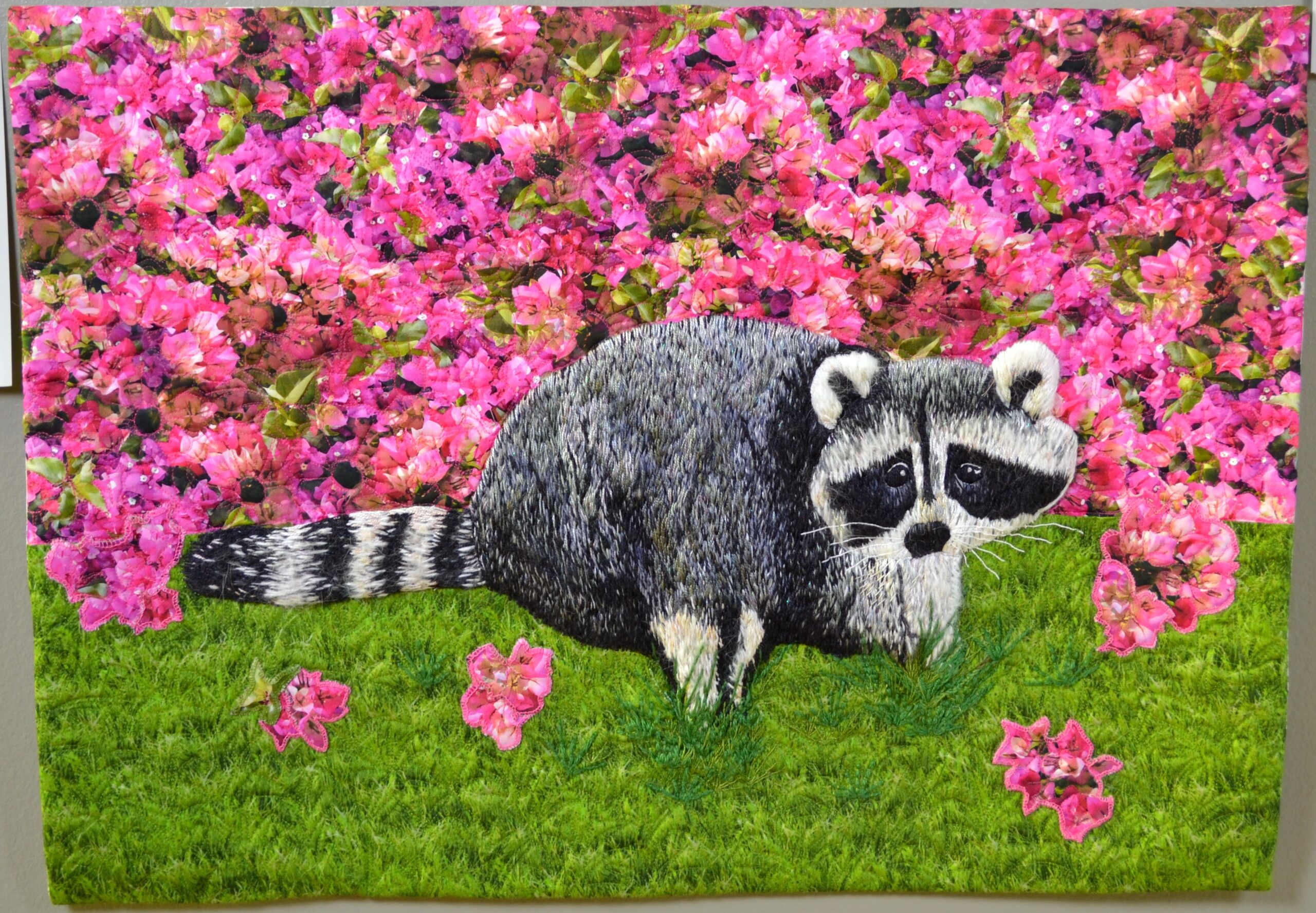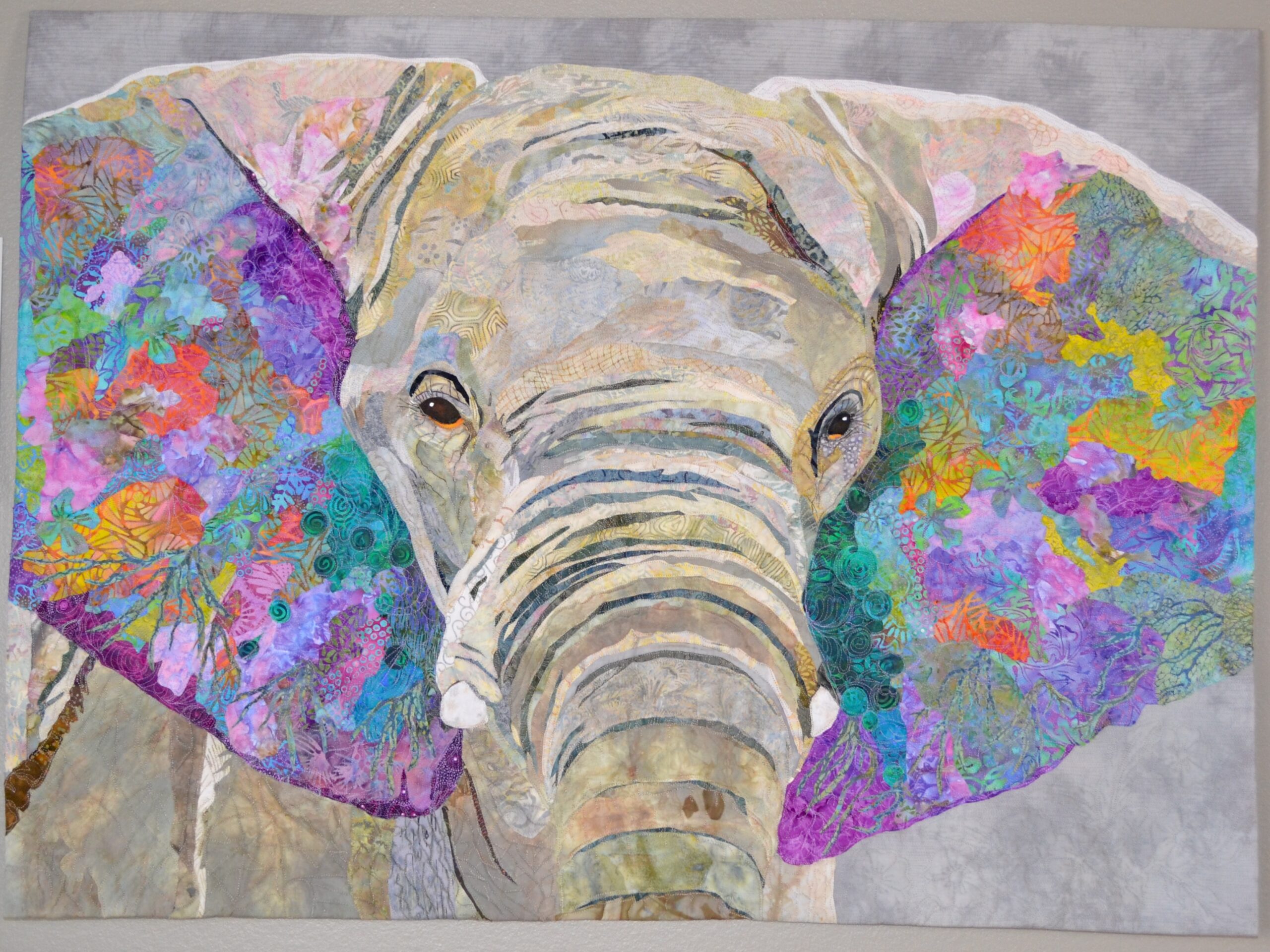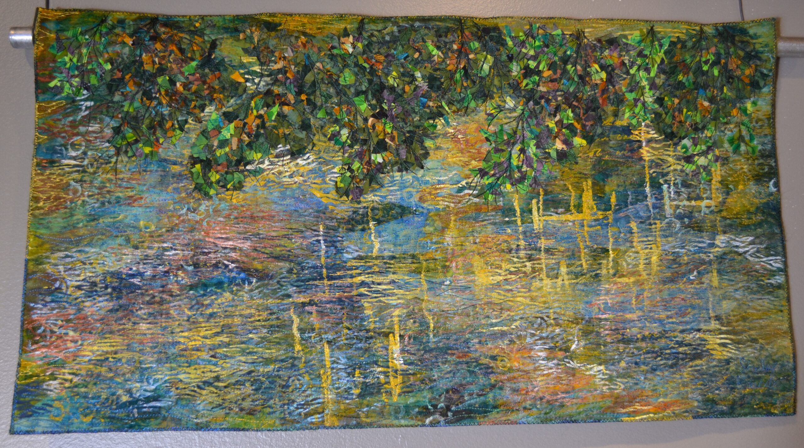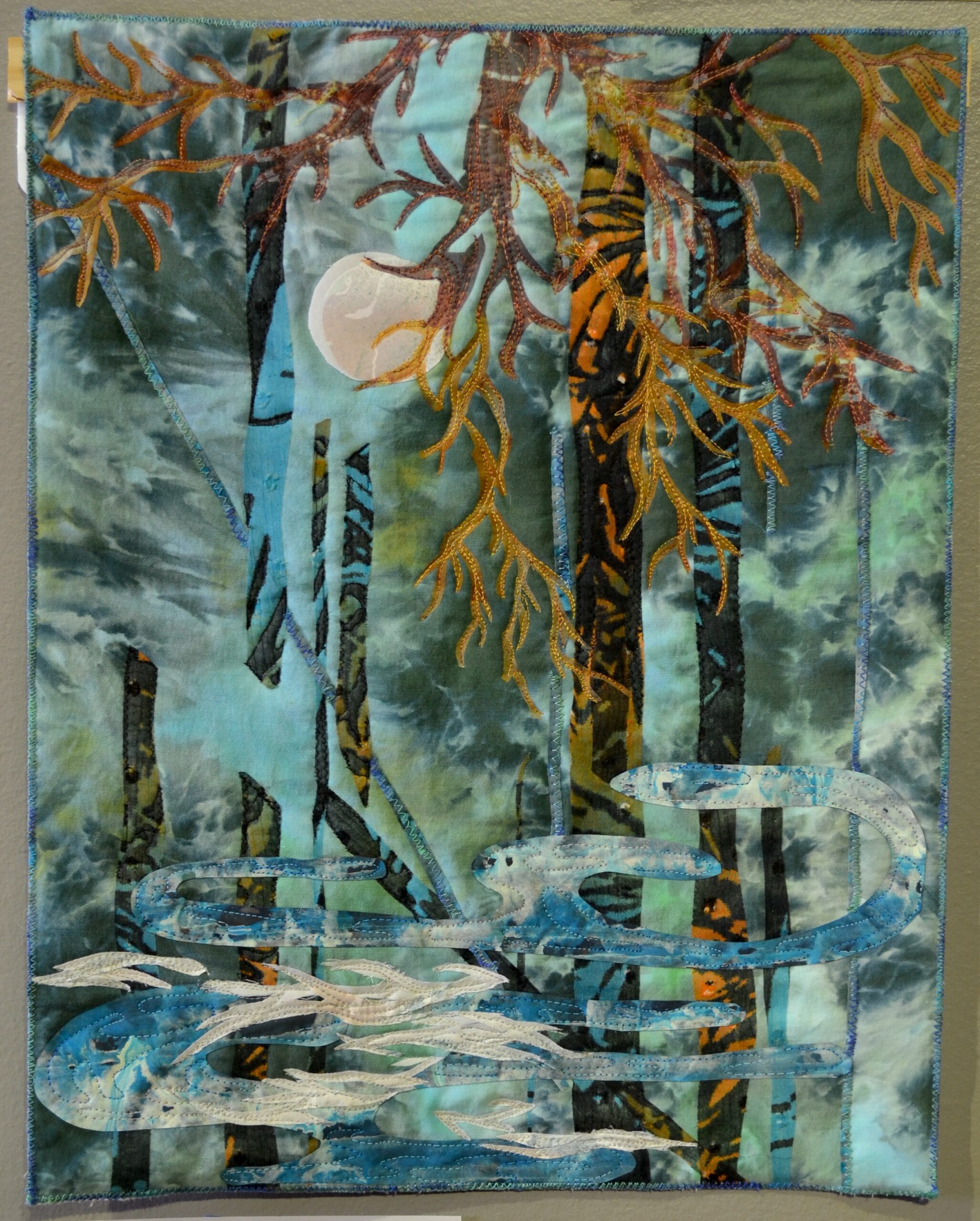 Hand-dyed cotton, rayon and silk, raw applique, machine stitching
