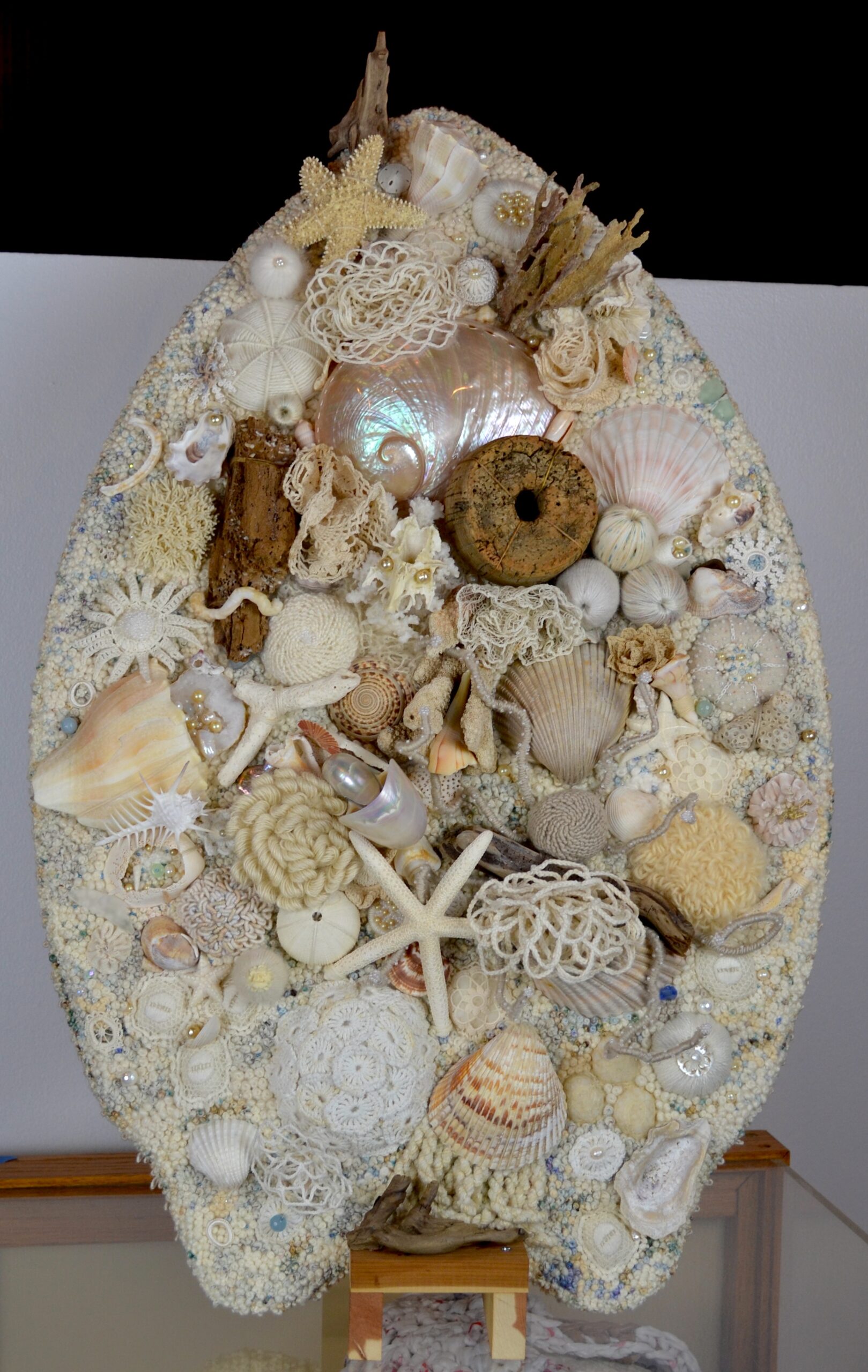 Hand embroidered using wools, cottons, silk and mohair threads. Many natural elements were used including, shells, starfish, driftwood, coral, oysters, fish skeleton, several varieties of fresh water pearls. Antique, vintage linens and lace were repurposed. Stitched on a vintage wooden skimboard.