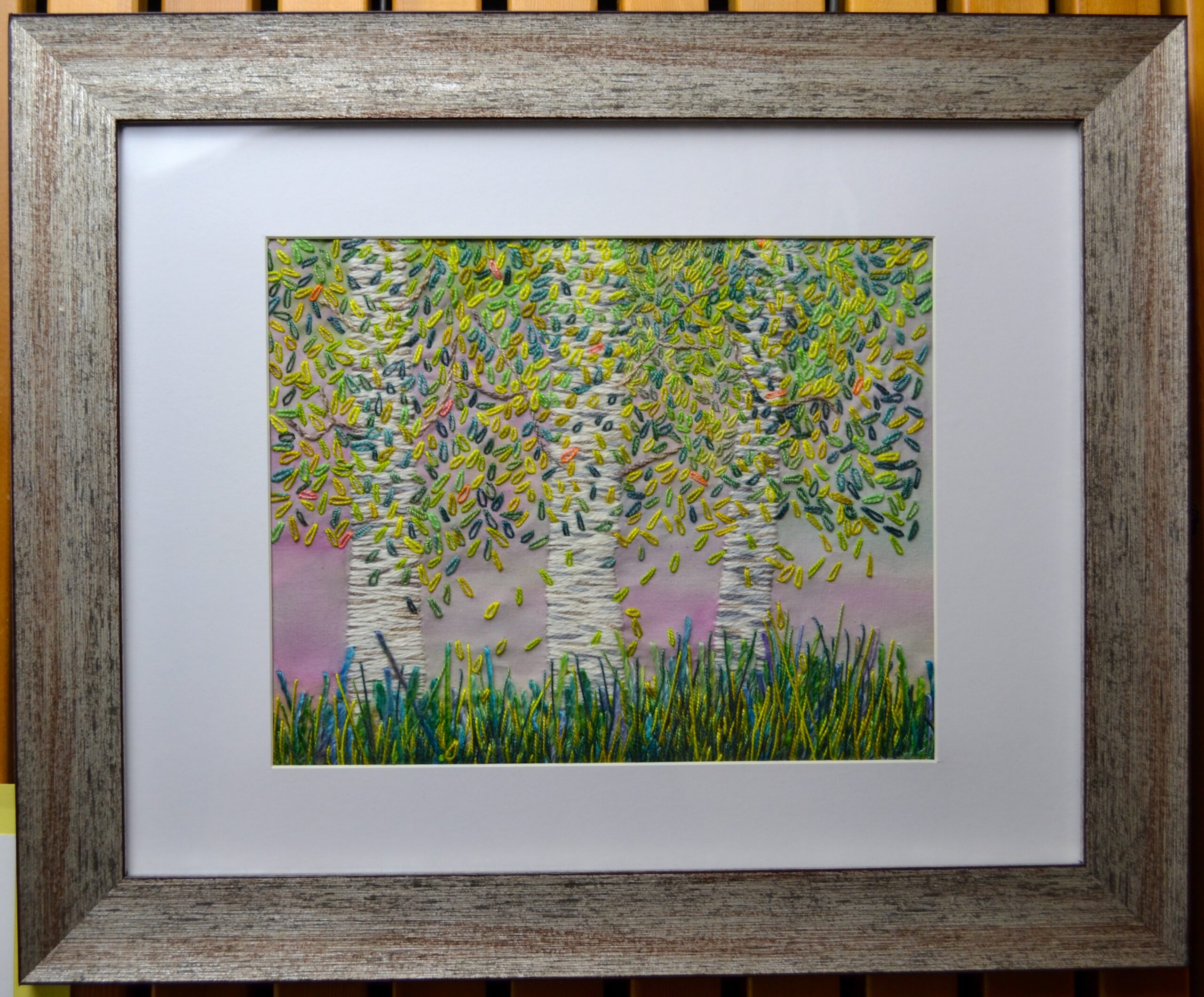 Fabric background, overpainted with watercolor. Hand embroidered trees and foliage. Cotton, wool, cashmere and silk threads were used to create the scenery.