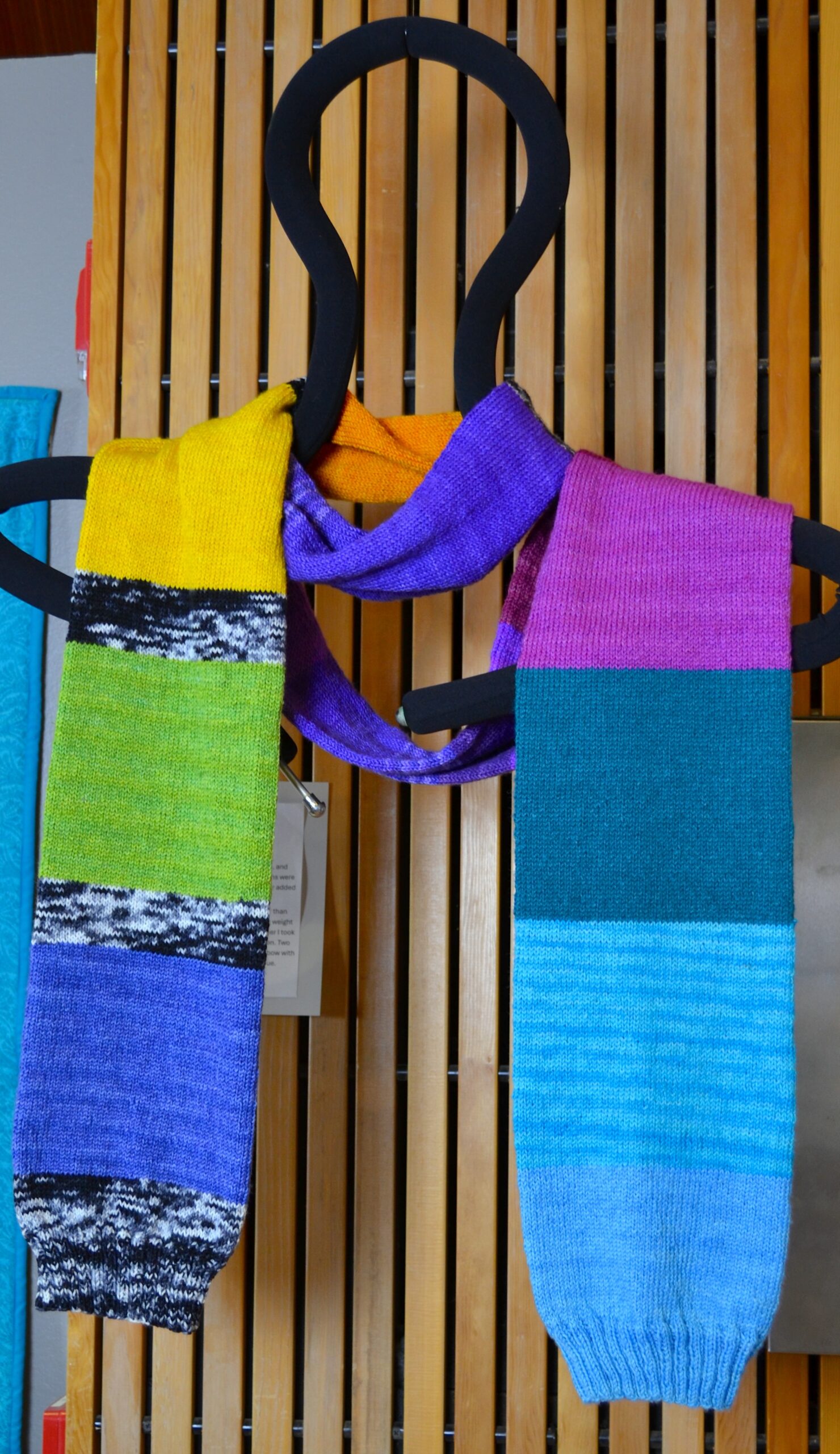Hand knit using a blend of Merino wool, cashmere, and nylon fingering weight yarn. Fourteen color mini skeins were used along with a skein of a black/white/grey skein for added interest to one side of the scarf.