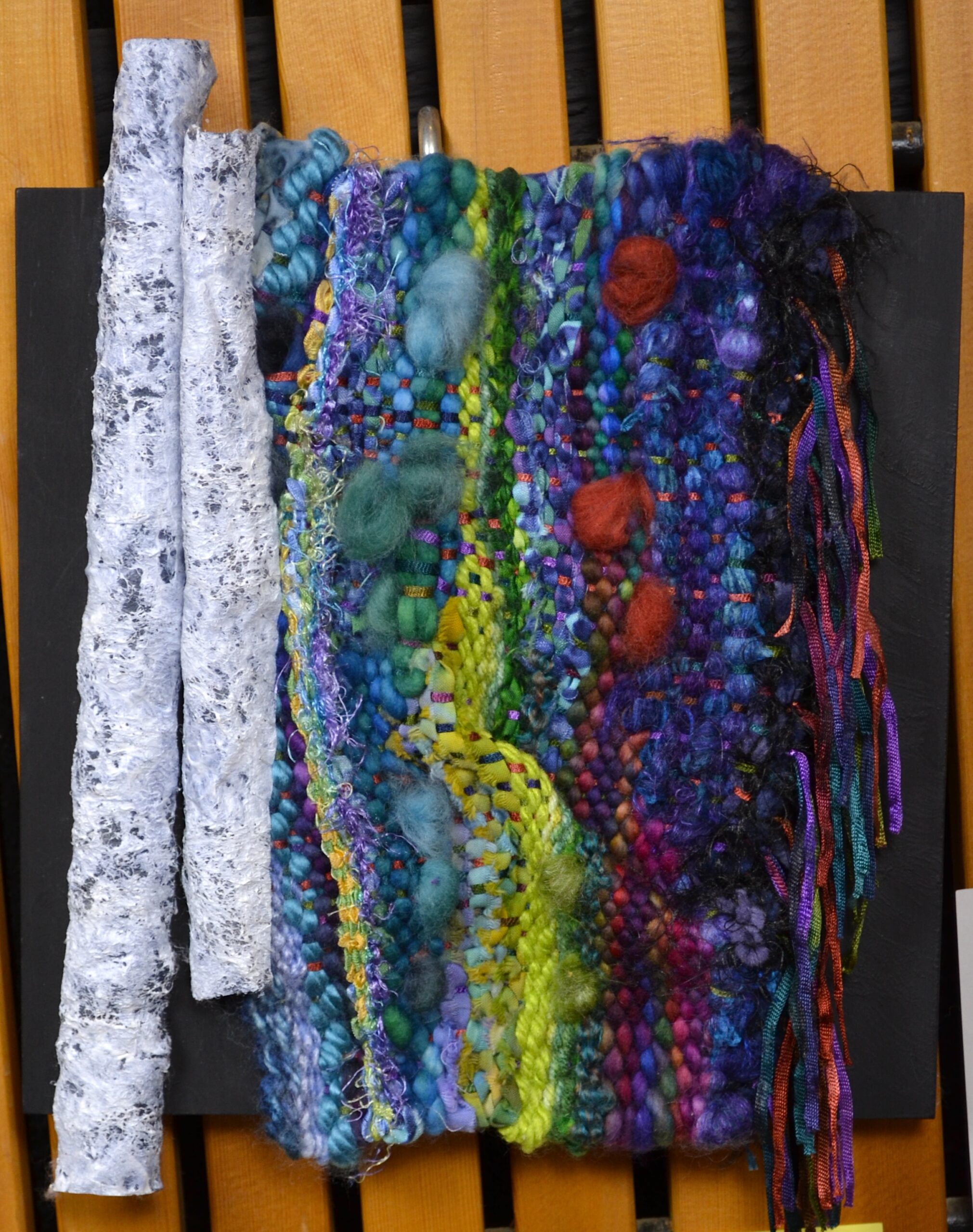 Hand woven, pulled warp threads, hand dyed cotton and silk fabric strips, needle-felting, fabric stiffening
