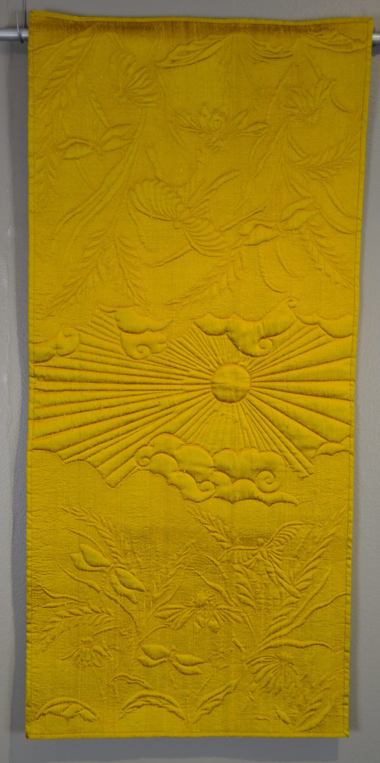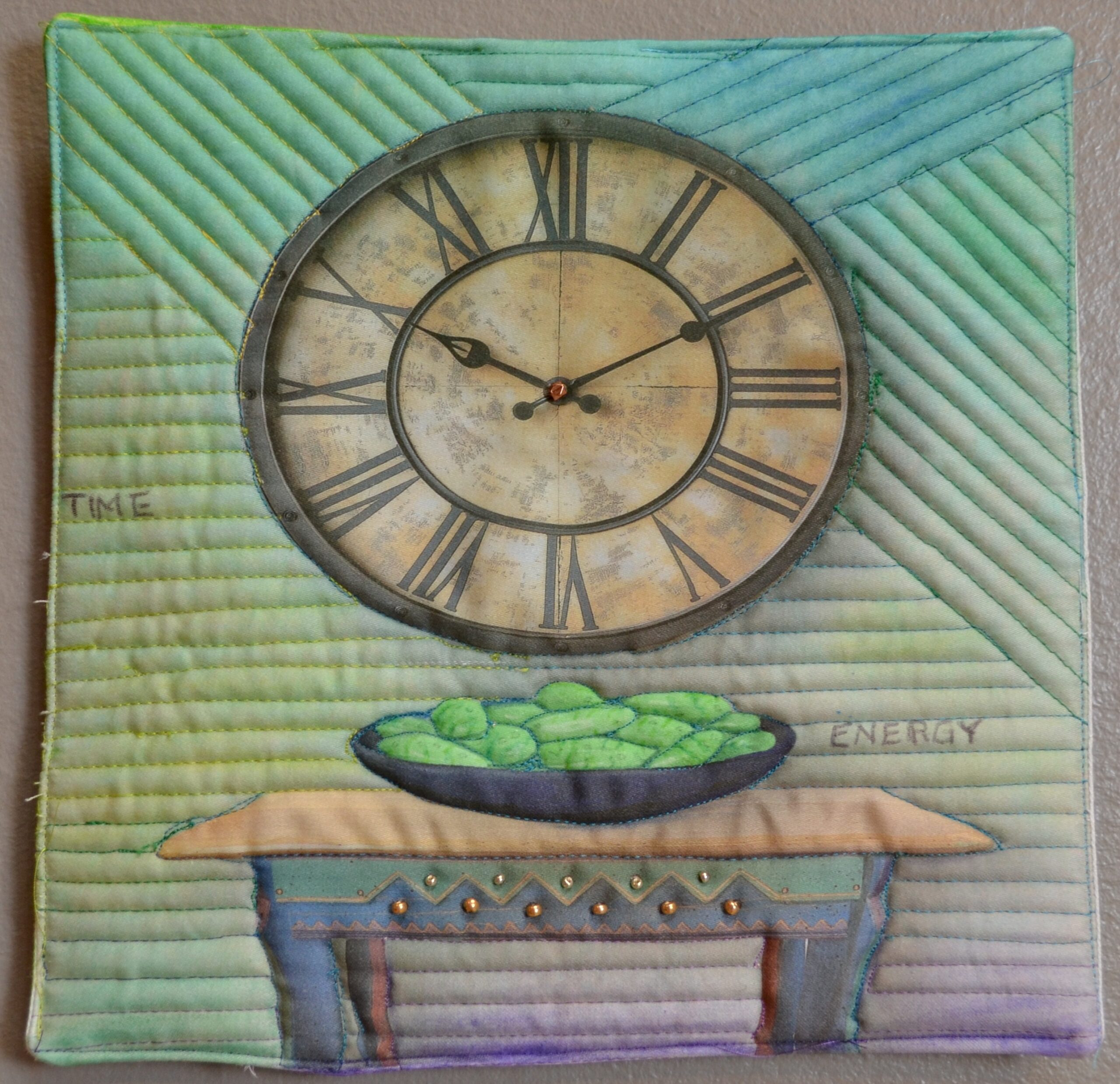 Techniques include, hand dyed silk fabric, applique, and free motion and ruler work quilting.