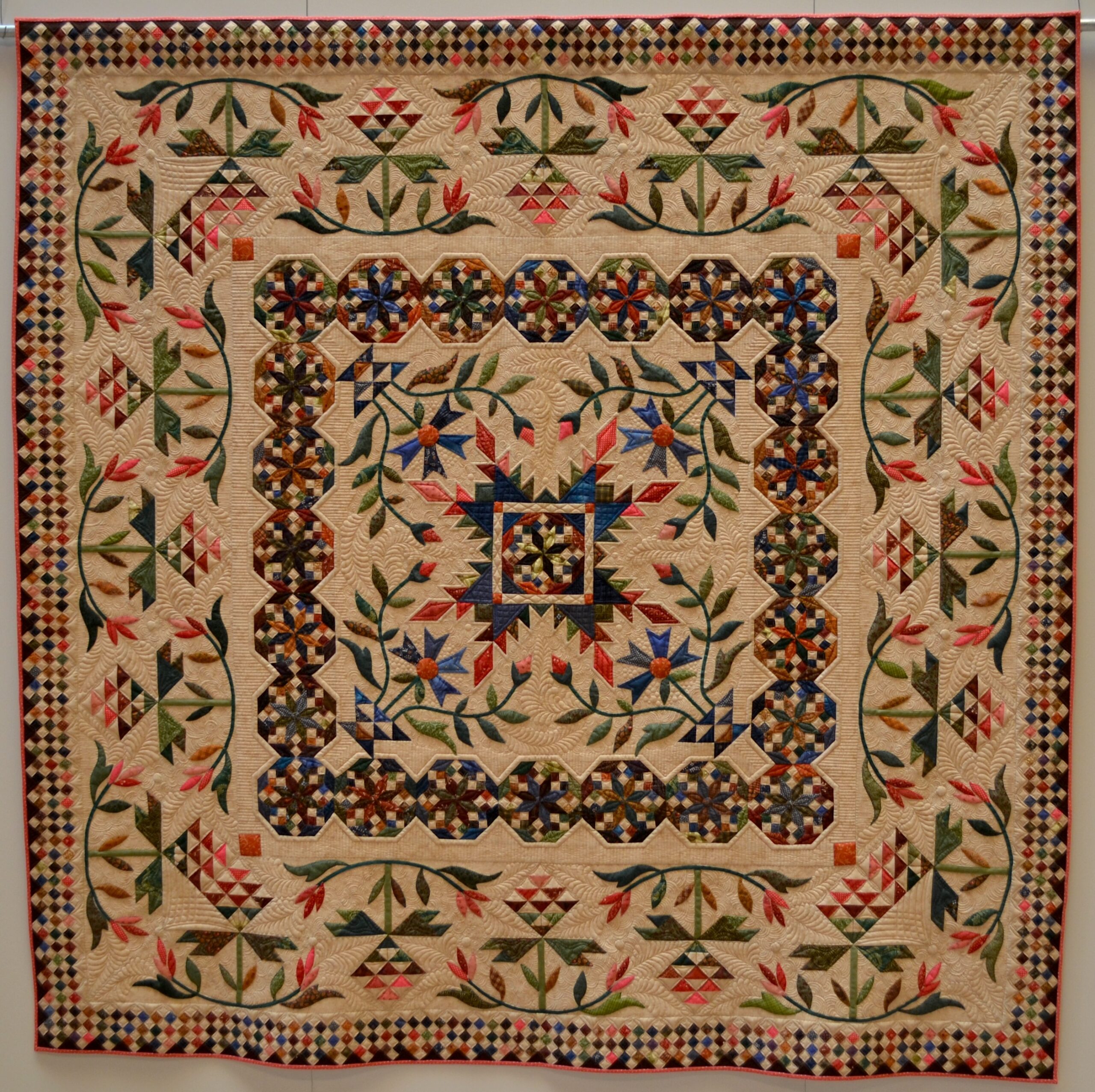 All free motion pictorial quilting with a tiny bit of ruler work.