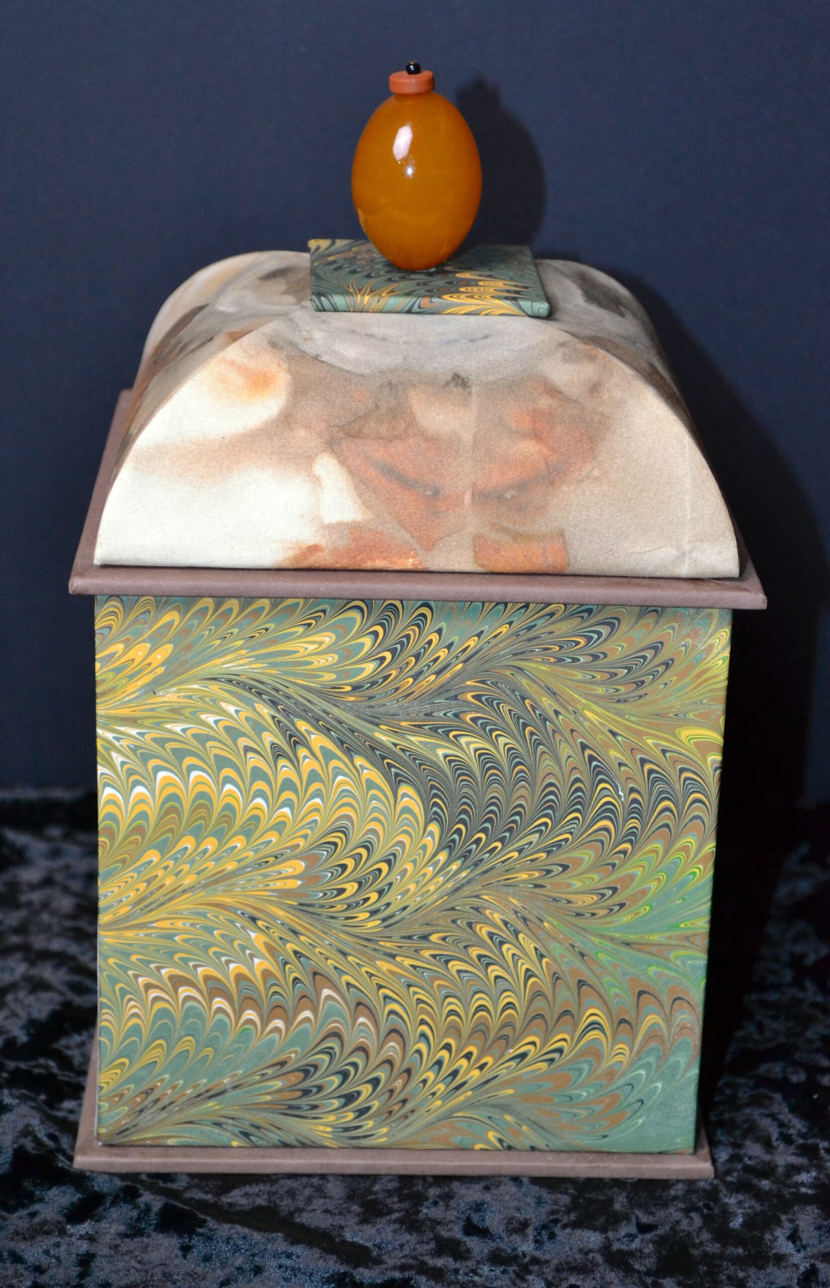 Box was made in Steve Pittlekow’s class of paper I marbled and using botanical handmade paper made by Velma Bolyard, a friend of Steve’s. The top is made from Amber, clay and glass beads.