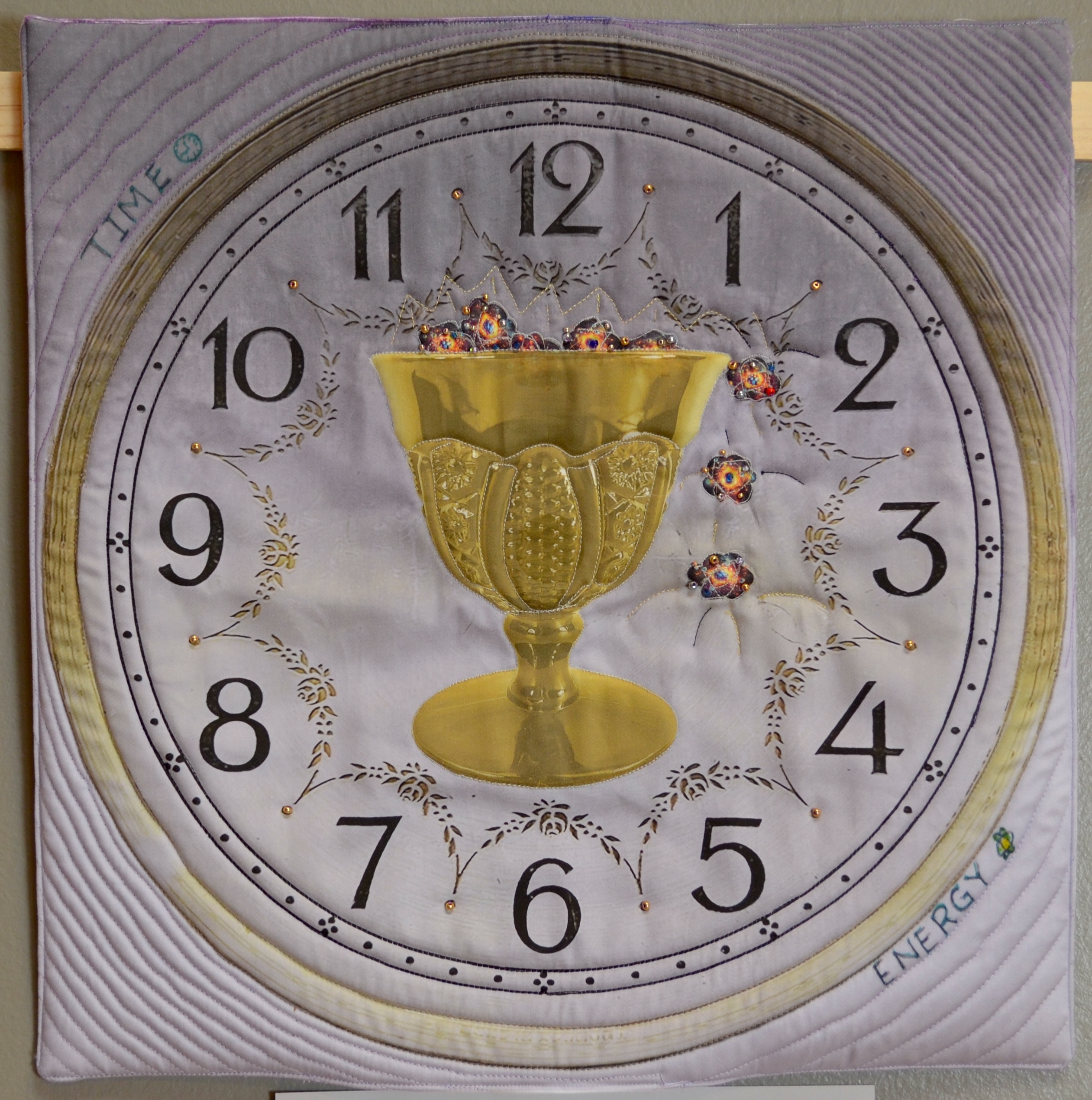 The quilt is a digital composite printed onto cotton sateen and enhanced with Inktense pencils. Texture and dimension are added with beads and trapunto and quilting. Some items in the composite were AI generated