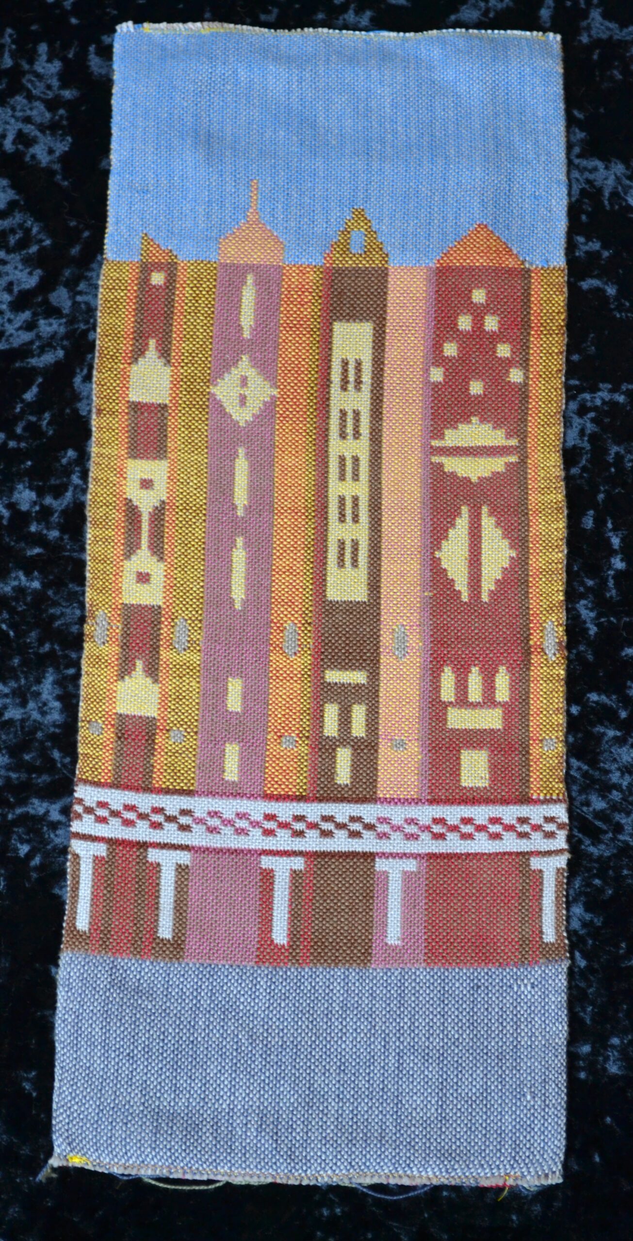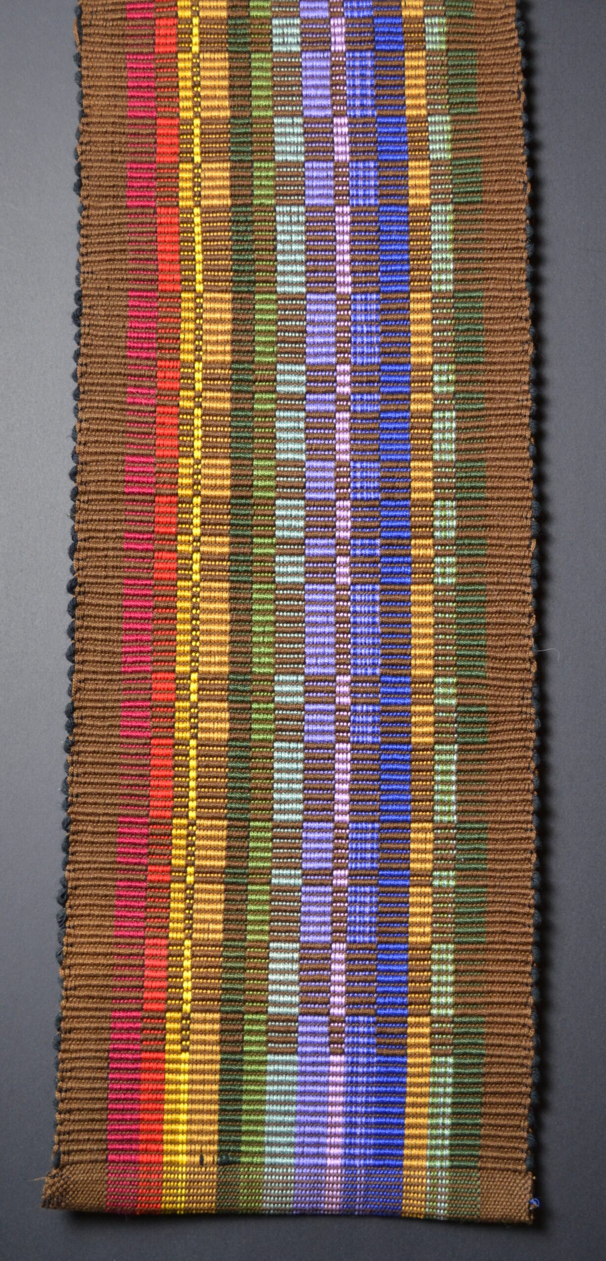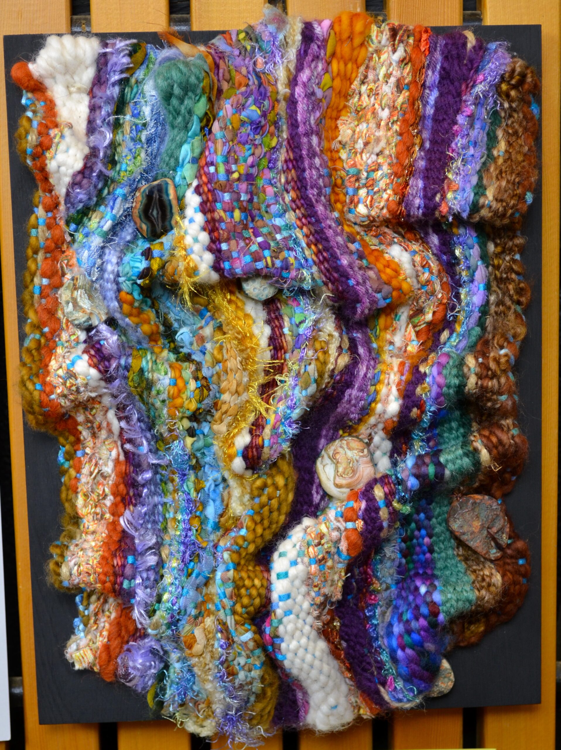 Hand woven pulled warp threads, hand dyed cotton and silk fabric strips