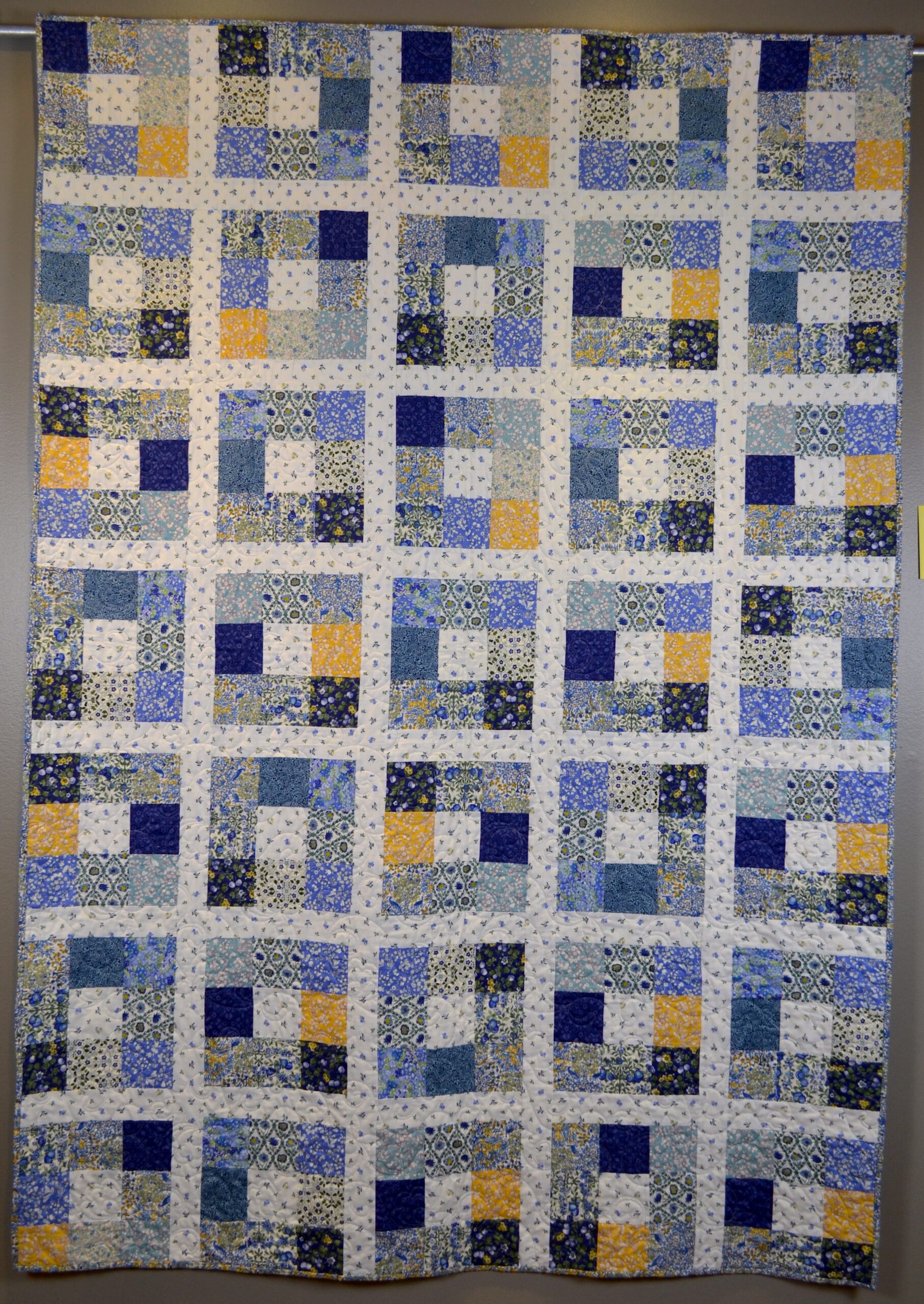 Machine pieced by Myra Janus. Long arm machine quilted by Amy Parker. I used a basic nine patch pattern with sashing because I wanted people to be able to see the beautiful fabrics without cutting them up too much.