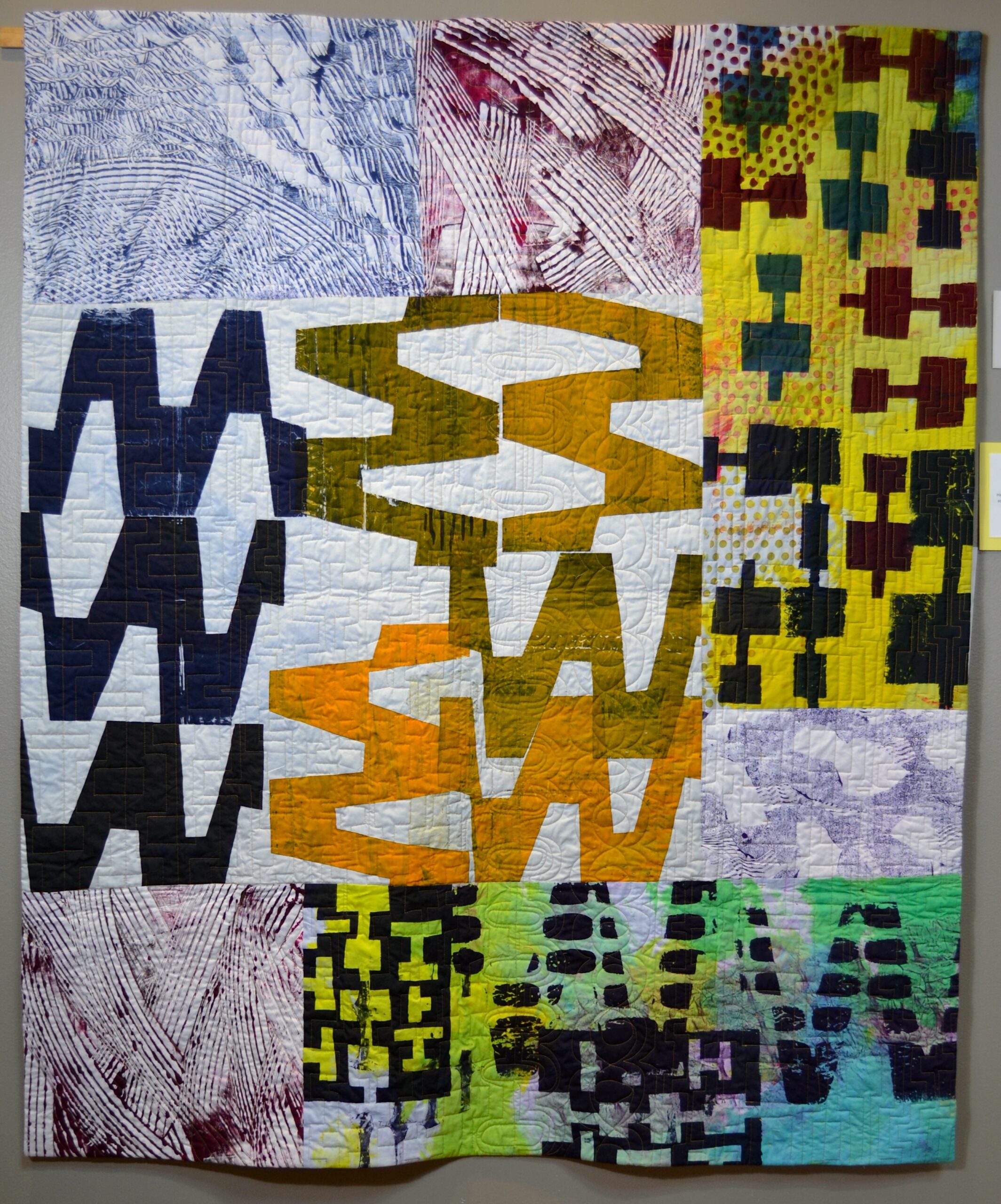 Hand printed fabric. Techniques included rubbings, stencils, screens, monoprinting, direct application. Minimal piecing. Long arm quilted.