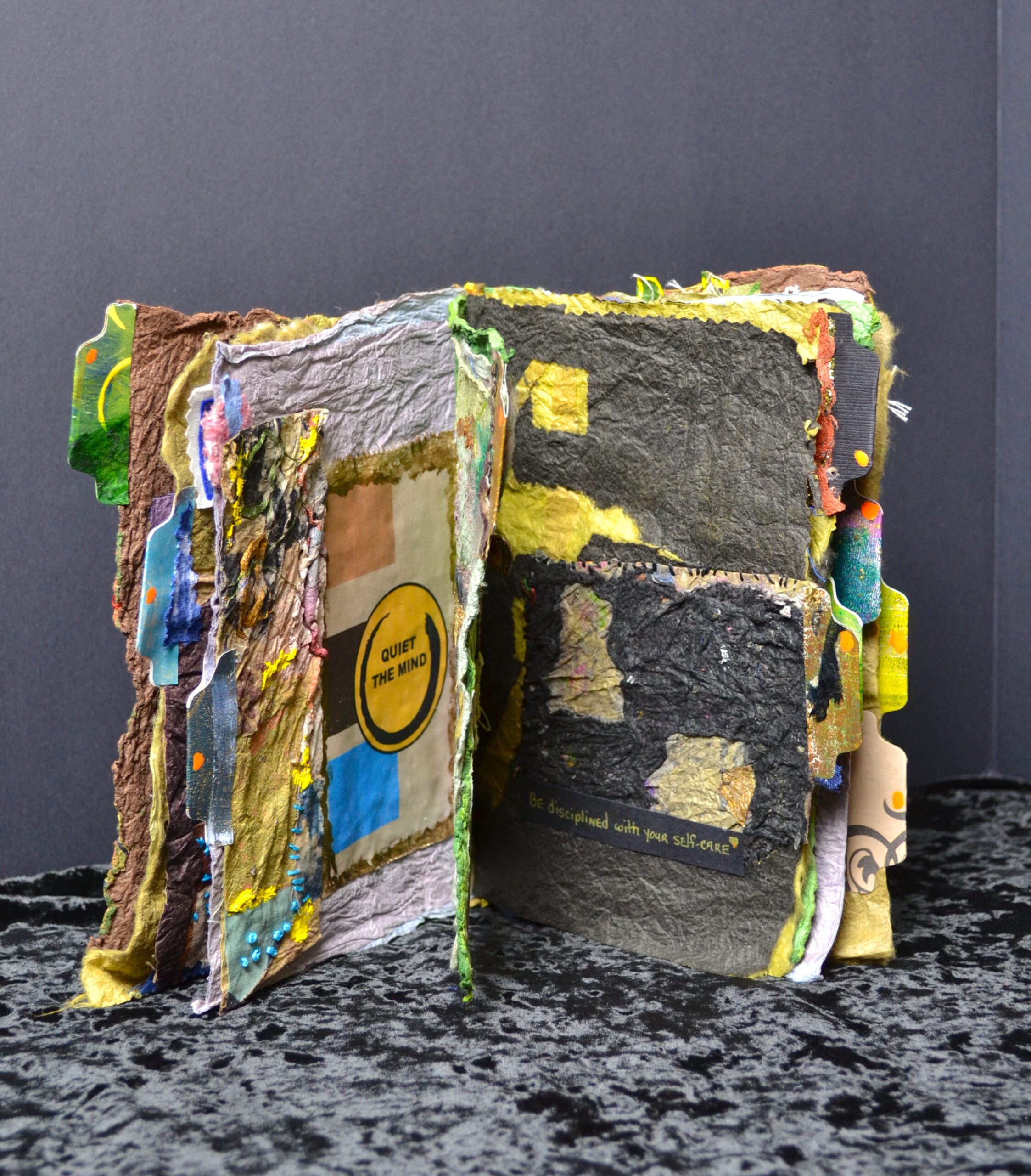 This 19-page Journal is made using the Hanji paper technique, Joomchi. Each page is Joomchi and includes a mix of fabric with graphic design image transfers, paint, hand embroidery, and collage.