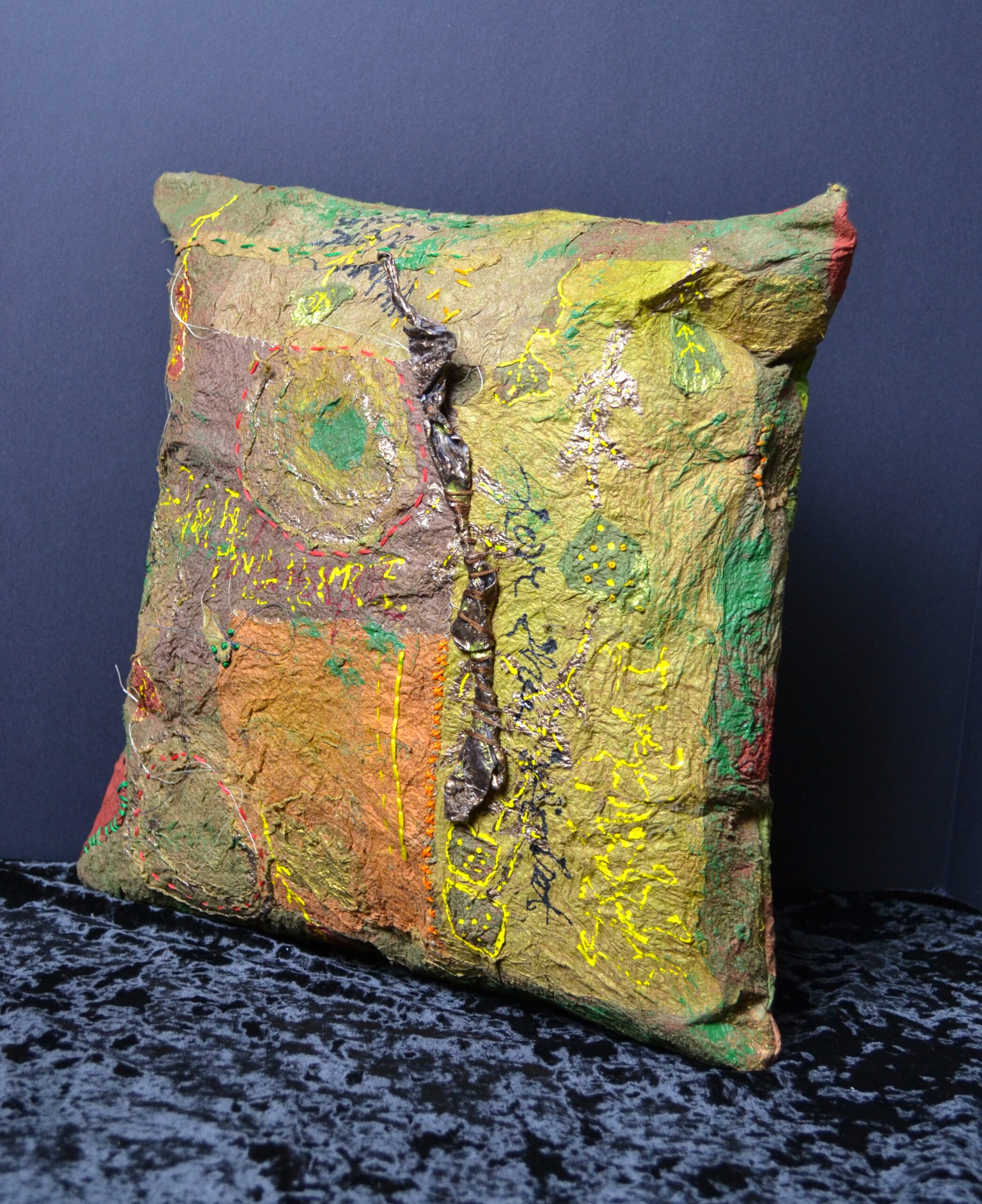 This (all paper} pillow is handmade from the hanji paper technique, Joomchi. It is filled with poly-fil and is embellished with paint and has bits of hand embroidery.