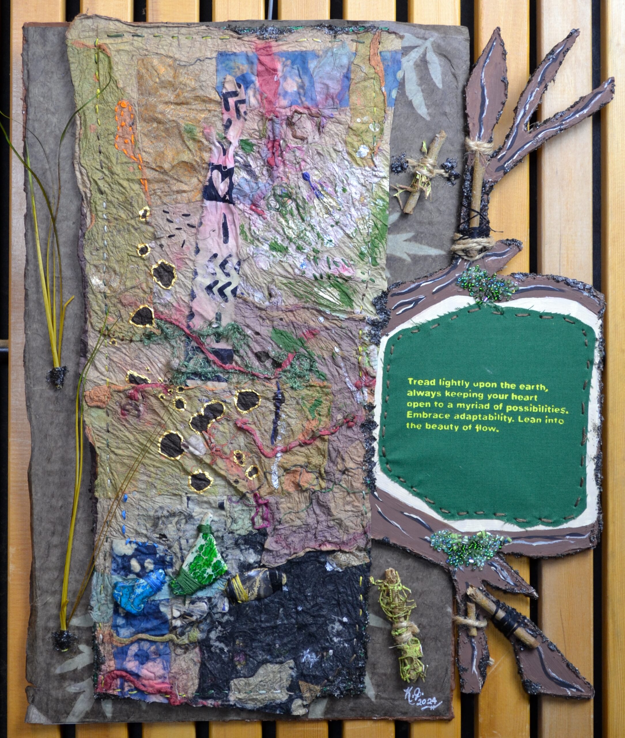 This hanging piece is made from the Hanji paper technique, Joomchi and includes the use of recycled cardboard, fabric, paint, hand embroidery, stones, twine and sticks.