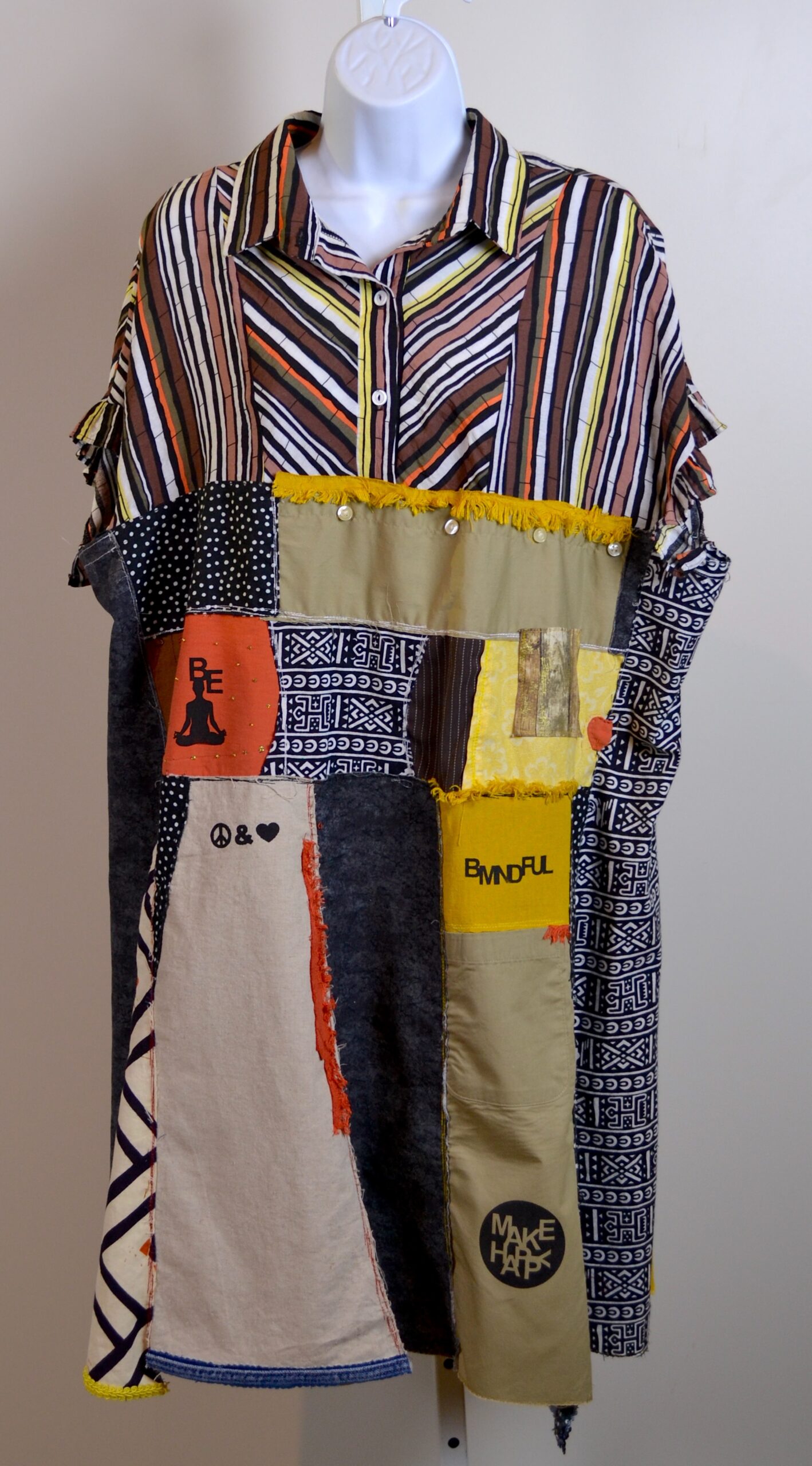 This upcycled dress was made using pieces of other garments that were no longer being worn. Includes: A man’s shirt, woman’s pants, woman’s shirt and raw edge fringe from a couple of knit tops. It is also screen printed with a few graphic elements and has freeform seam sewing.