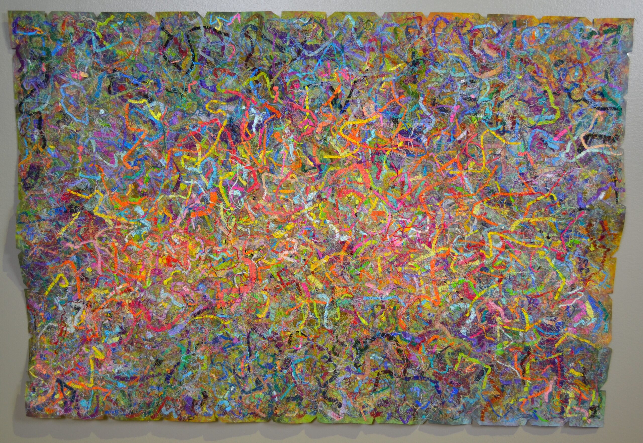 Hand-dyed and commercial fabrics, Recycled clothing, scraps and threads Improvisational composition, Machine stitched.
