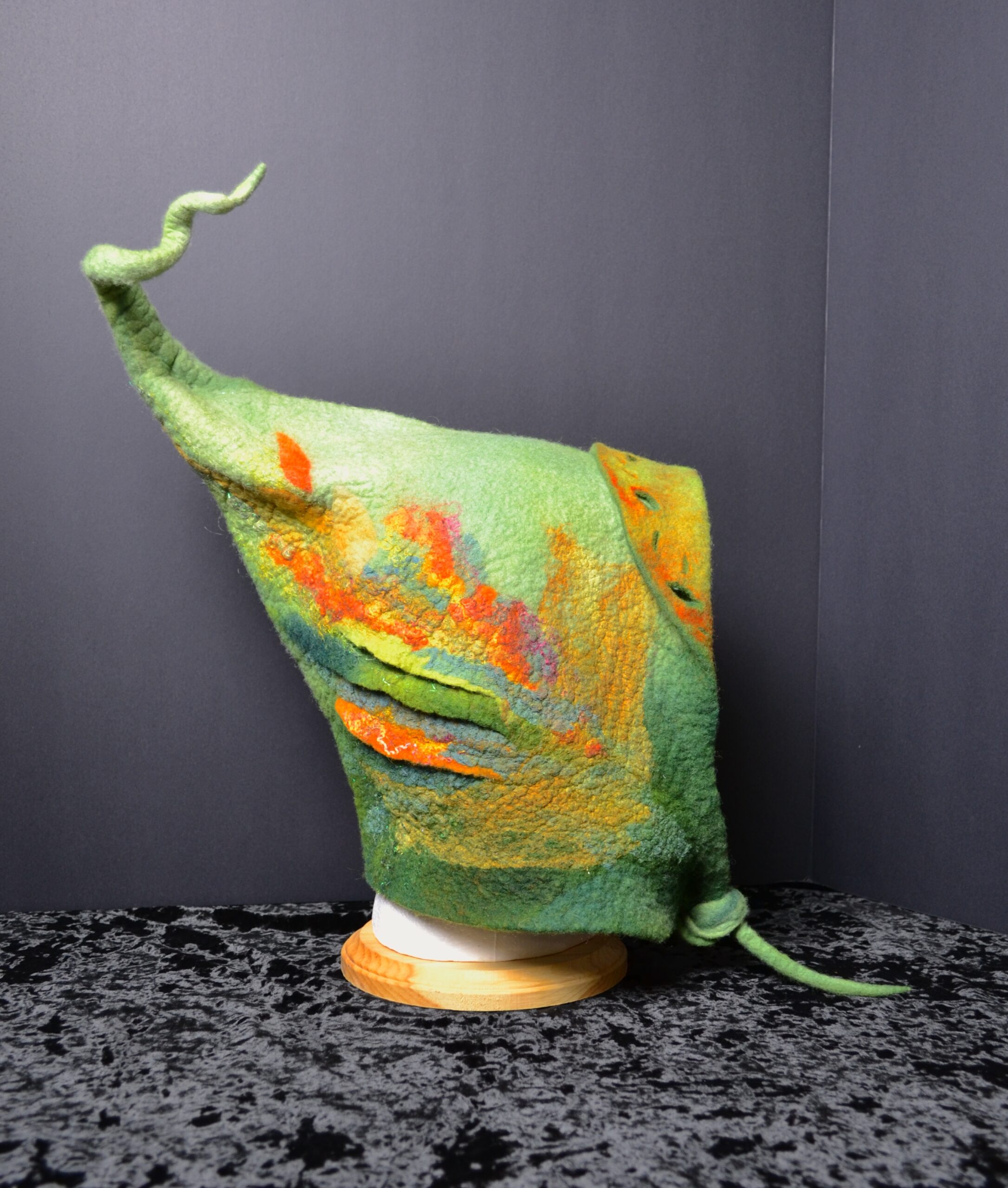 This piece was wet felted with hand dyed merino wool batting, embellishment fibers and textured with the use of resists to create the unique surface design.