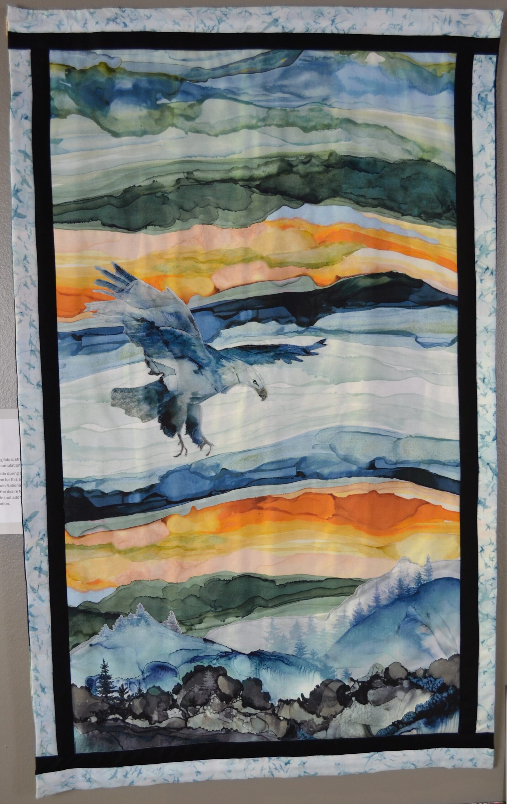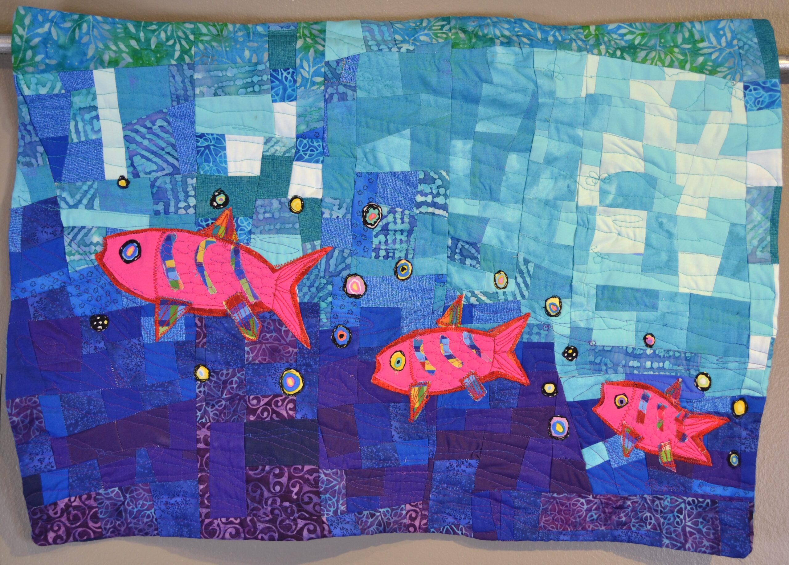 Pieced and fused fabric, free motion quilting. Machine and hand appliqué.
