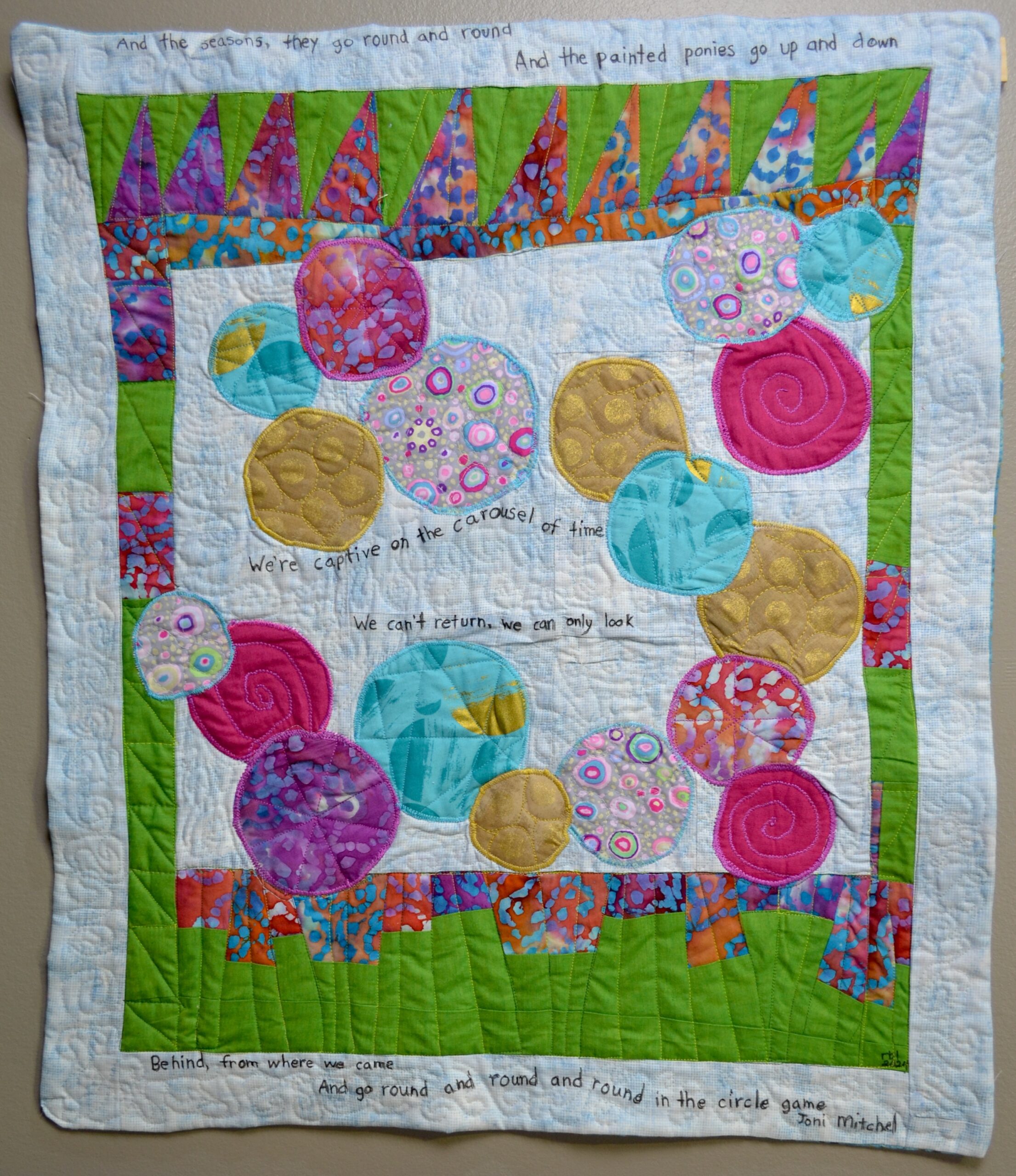 Fused, pieced, free motion quilting. Hand lettering