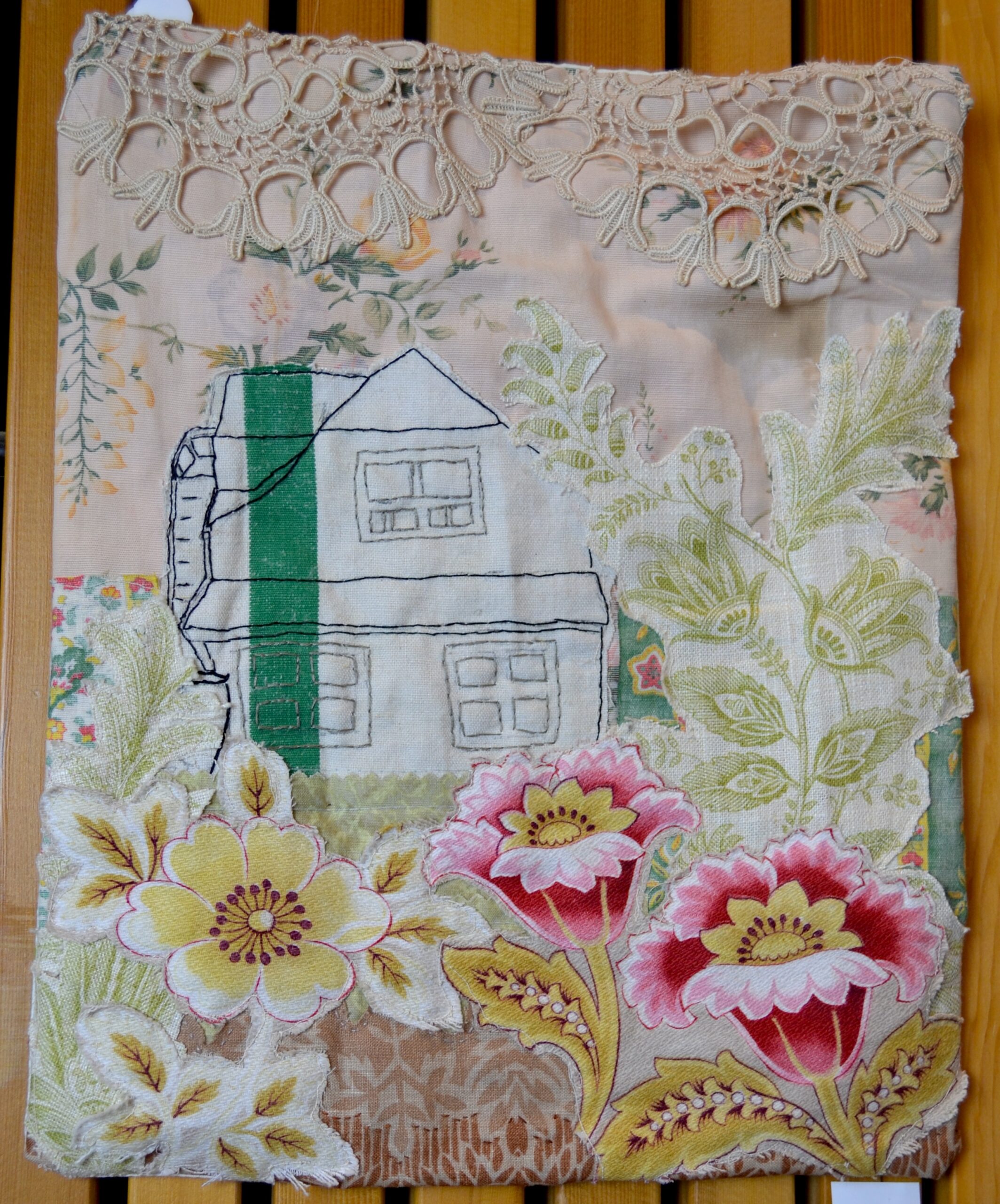 Piece was free motion machine stitched and hand embroidered.