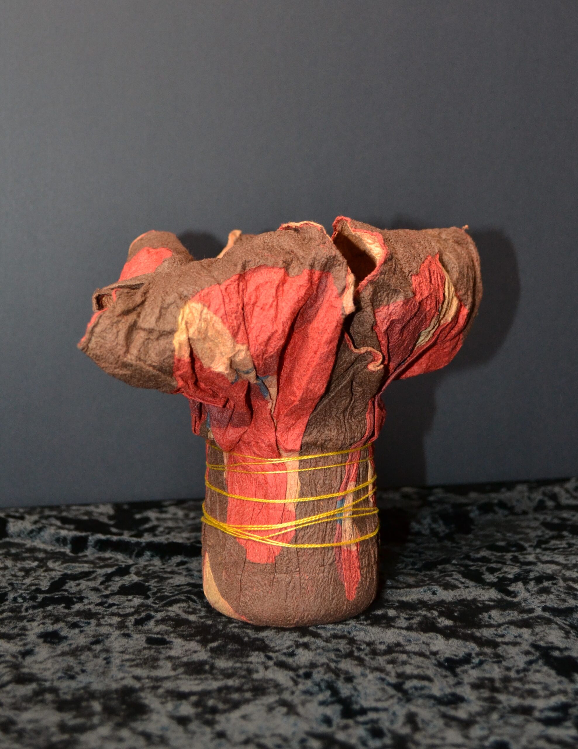 Multiple layers of Korean mulberry paper felted together in the Korean method of Joomchi molded around a small glass jar.