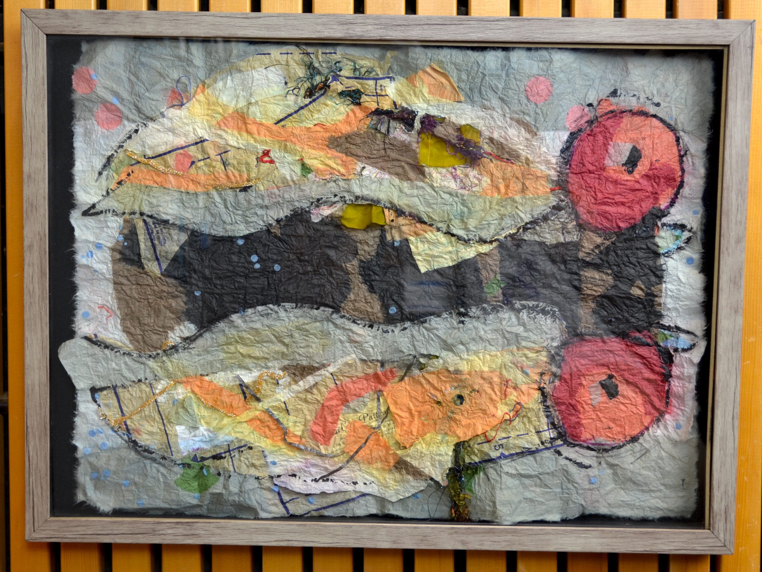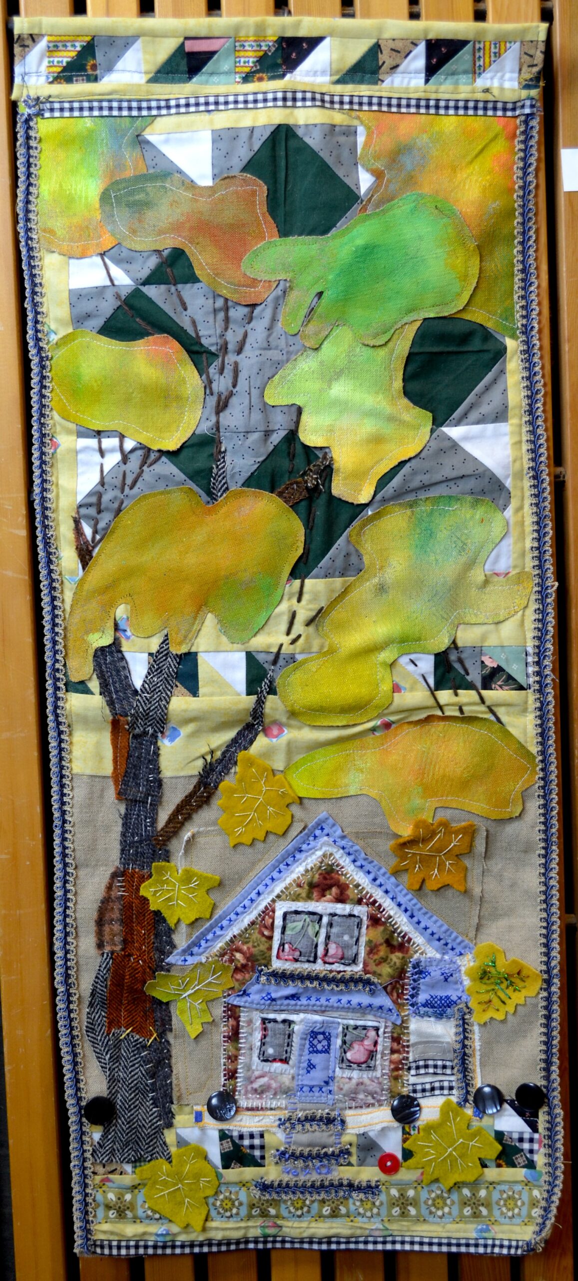 The big yellow maple tree and my house. Stitched with found fibers, quilt squares and painted canvas on linen. Anne Kelly Workshop November 2023 Anne Kelly is known for her multi-layered mixed media textile works. Her collages have a substantial and highly textured look, reminiscent of tapestry