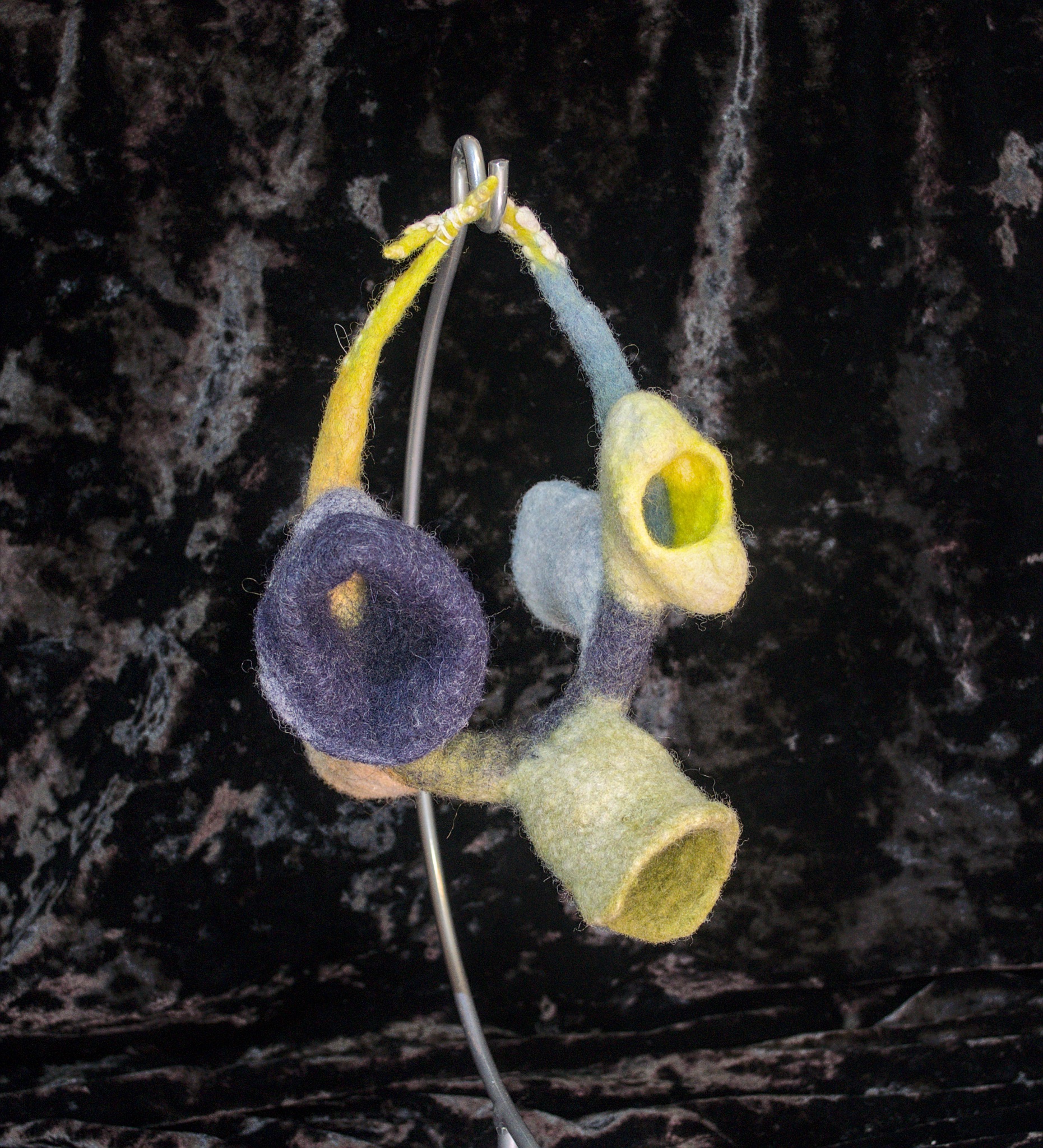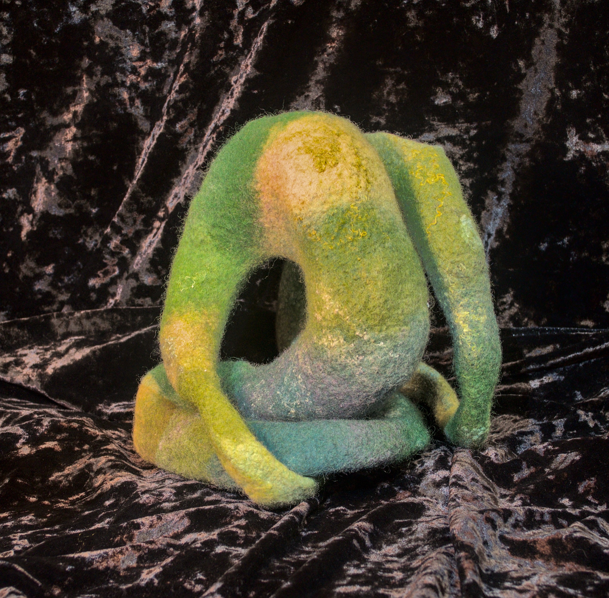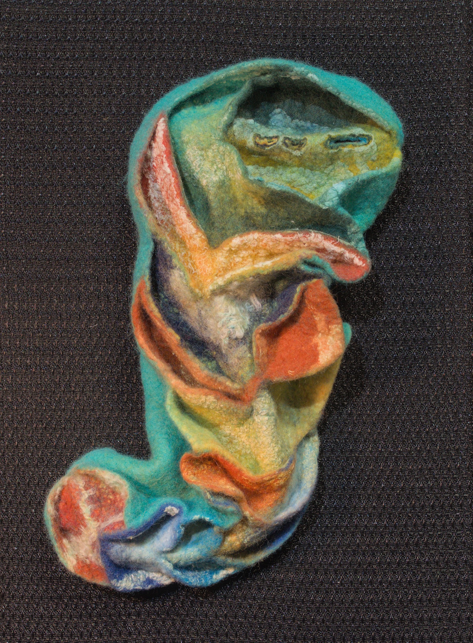 This piece was partially felted in pieces, shapes sewn on rope form, resists removed, then felt was fulled and shaped.