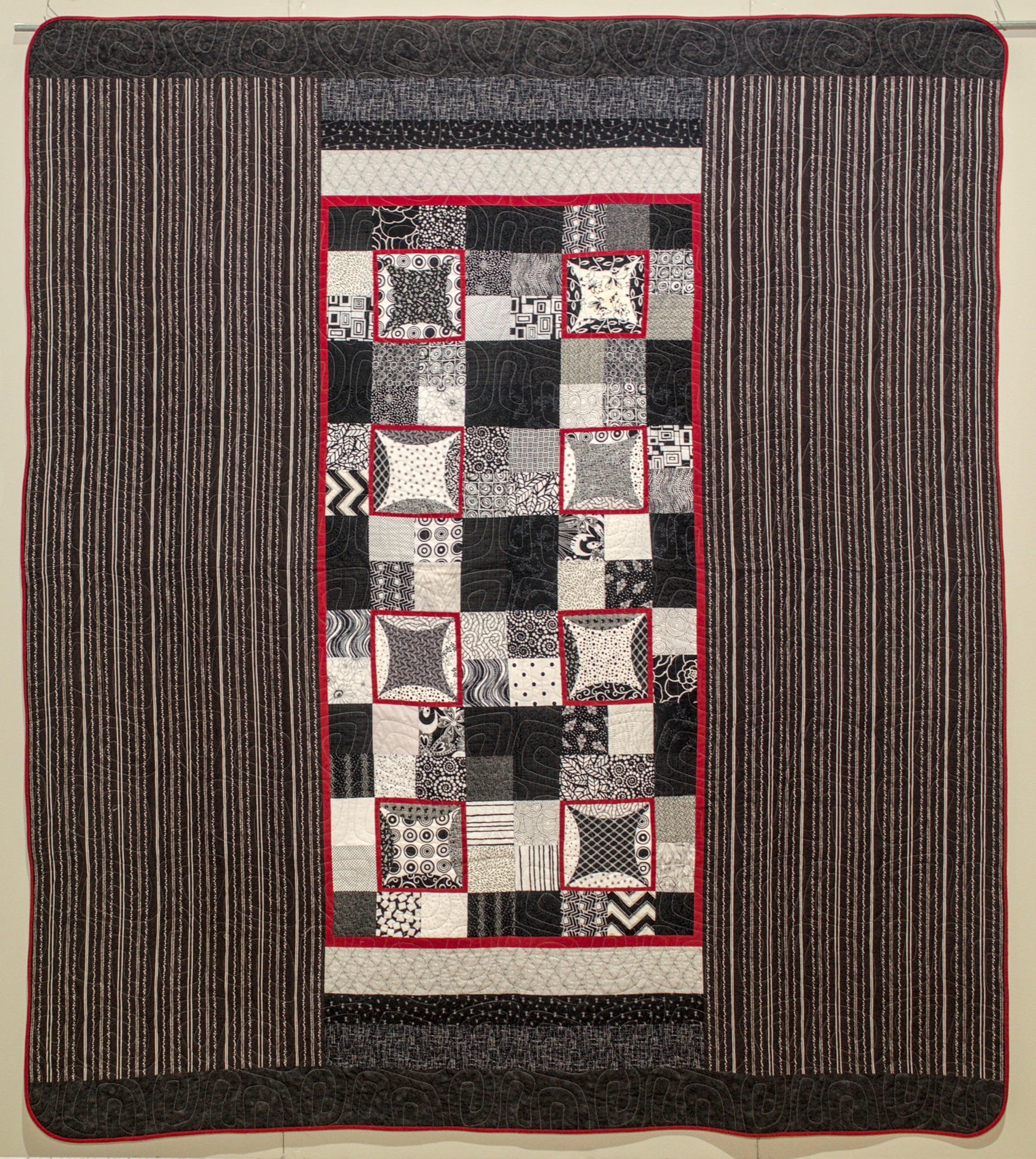 The maker of the 8 red-framed small squares is unknown. The squares appeared in my stash and play nicely with other black/white fabrics I found. Long arm quilter: Quilter’s Heaven quilt shop, Northbrook, IL